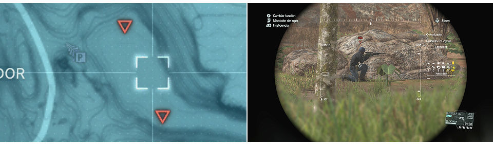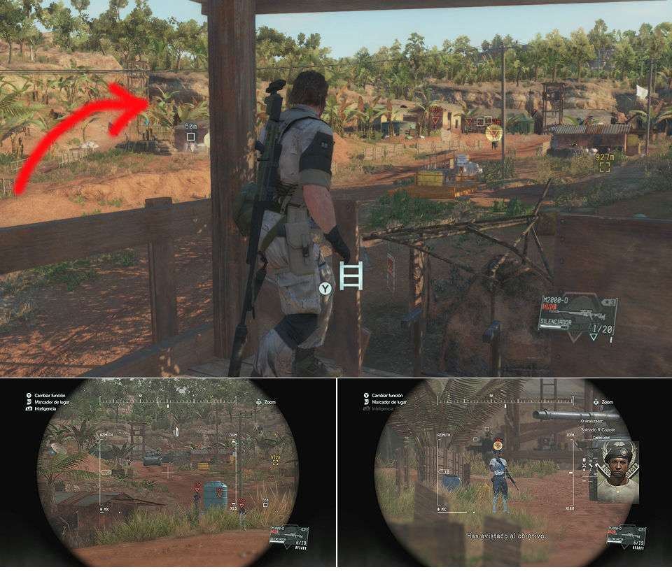 Aún así la plantación esta muy bien vigilada por bastantes soldados, la mejor manera de infiltrarse en ella es yendo por la izquierda (puntos rojos imagen grande) ayudándonos de las plantas y las edificaciones para pasar desapercibidos, cuando identifiquemos el objetivo recordemos que basta con eliminarle.