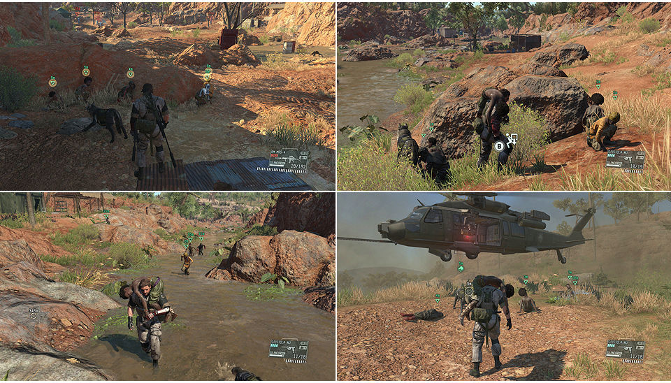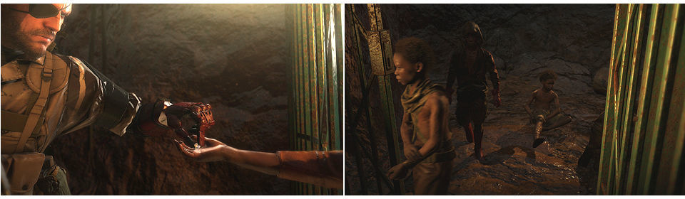 Ahora tenemos que extraer a los niños, si todavía no hemos conseguido la mejora de Fulton que nos permite extraerlos, tendremos que bajar por el cañón para llegar a una zona de aterrizaje. Cuatro de los niños pueden caminar, pero al quinto hay que llevarle en brazos, podemos dar órdenes a los demás con los comando pulsando LB/L1, para que se escondan o nos sigan. Mucho cuidado en este tramo, ya que si los soldados matan a un niño se acaba la misión, durante el recorrido vamos a encontrarnos tres grupos de enemigos que deberemos neutralizar para escapar, pero siempre muy pendiente de los niños. Además tarde o temprano se darán cuenta de que los niños no están (ver objetivo opcional 5 para que no se den cuenta) y enviarán refuerzos desde la mina bajando por el cañón, aquí es bueno si tenemos minas ir dejándolas para los enemigos que nos seguirán.
