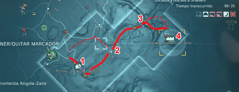 En el mapa de arriba vemos marcado un camino con puntos, es un atajo para futuras partidas, nos saltamos directamente el puesto de Munoko ya Nioka y llegamos hasta el puesto de avanzada 2, mejor pasar desapercibidos.