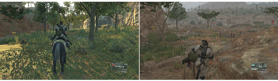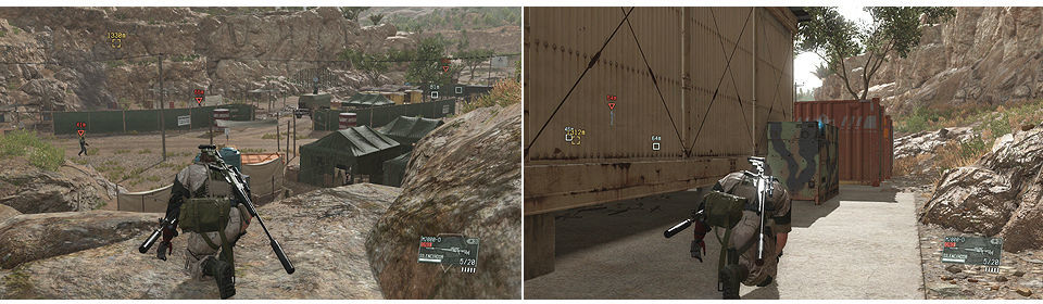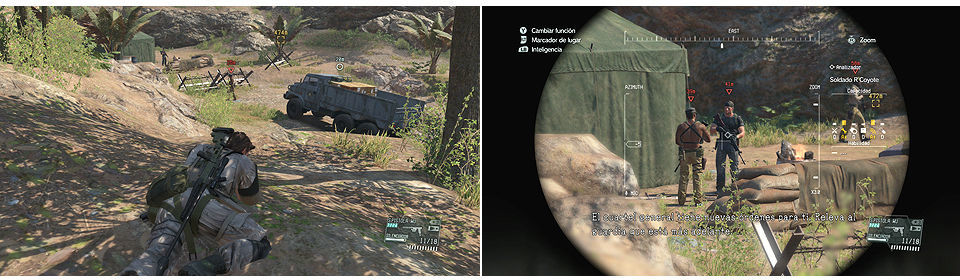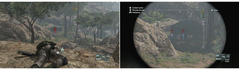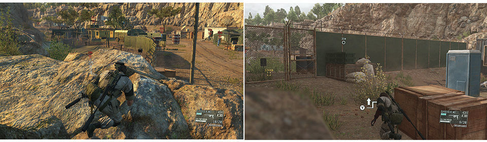 Si vamos por la derecha (Sur) llegamos tras pasar la entrada a una zona elevada perfecta para marcar enemigos, podemos bajar por las rocas y avanzar entre las tiendas.