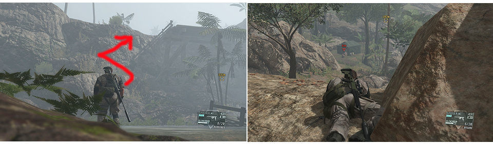 En el mapa al principio de la misión, al llegar al puente vemos unos puntos para ir por el norte, hay que bajar hasta el puente roto y escalar por la izquierda, evitamos tener que ir por la derecha a la zona de la niebla y los espantapájaros, saliendo en una posición elevada sobre el último puesto de avanzada.