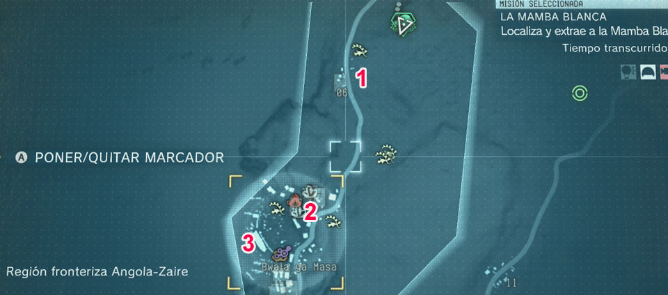 Comenzamos esta misión al Norte de la aldea Bwala ya Masa, nos encontramos con el puesto de avanzada 1, ¡cuidado! todos los enemigos de esta misión son niños y no podemos matarlos, hay que usar CQC y tranquilizantes para noquearlos o pasar desapercibidos, si matamos a cualquiera la misión terminará.