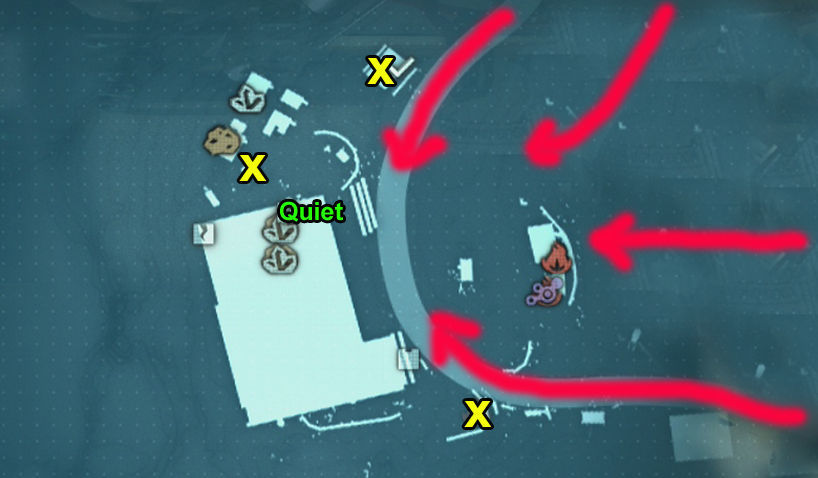 Por las municiones no debemos preocuparnos, al final de cada oleada Quiet aparecerá en nuestro posición y soltará una bengala pidiendo suministros, además tenemos varias recargas en las X marcadas en amarillo en el mapa de arriba.