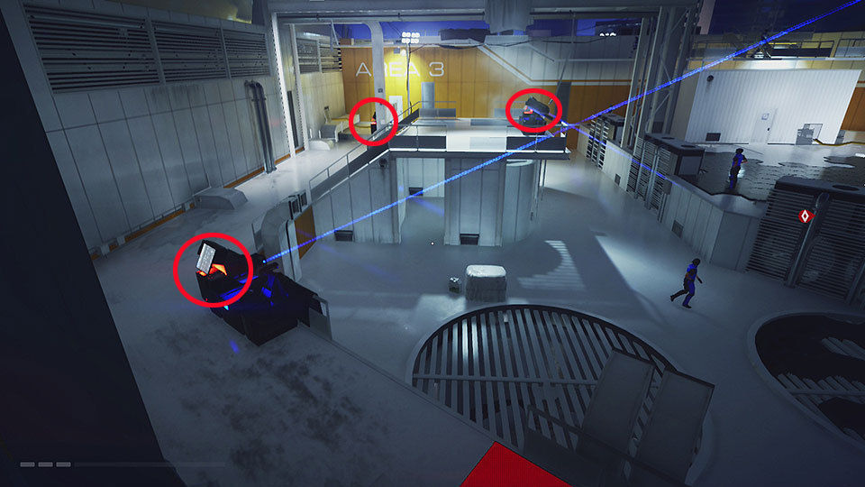 Nomad nos informa que seguramente hayan reforzado la seguridad. Aparte de los guardias, que hay bastantes, también tenemos 3 drones en la zona de la izquierda. Cada uno tiene un terminal para desactivarlos, lo mejor es esperar a que el Defensor de Choque que esta por esta zona se vaya y poder aproximarnos en sigilo para desconectar los drones.