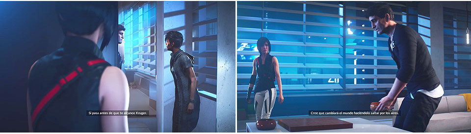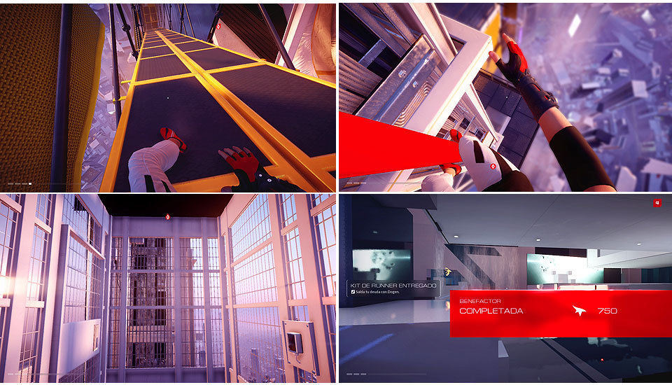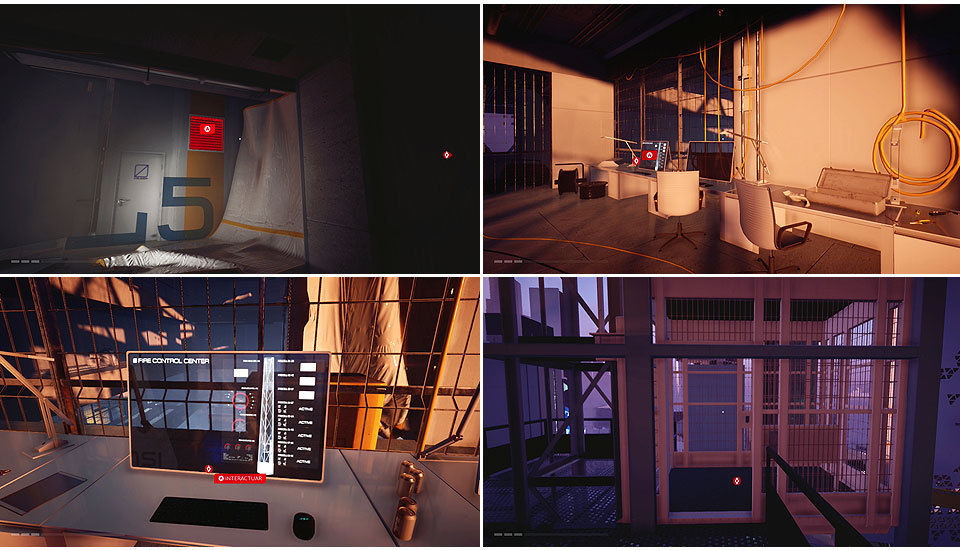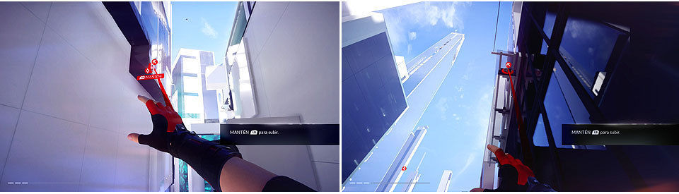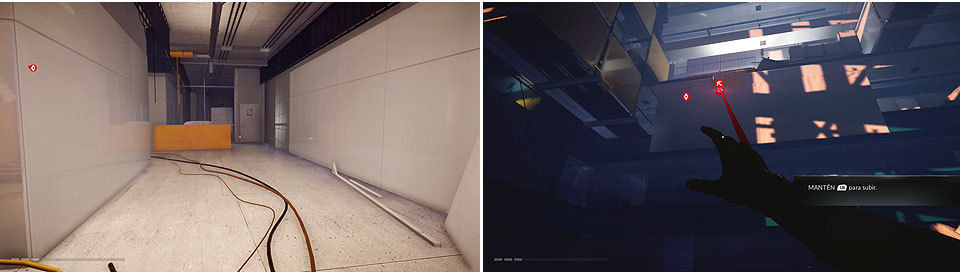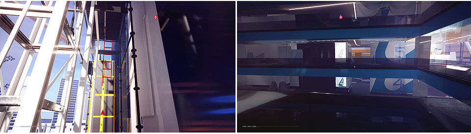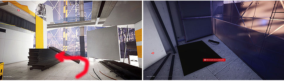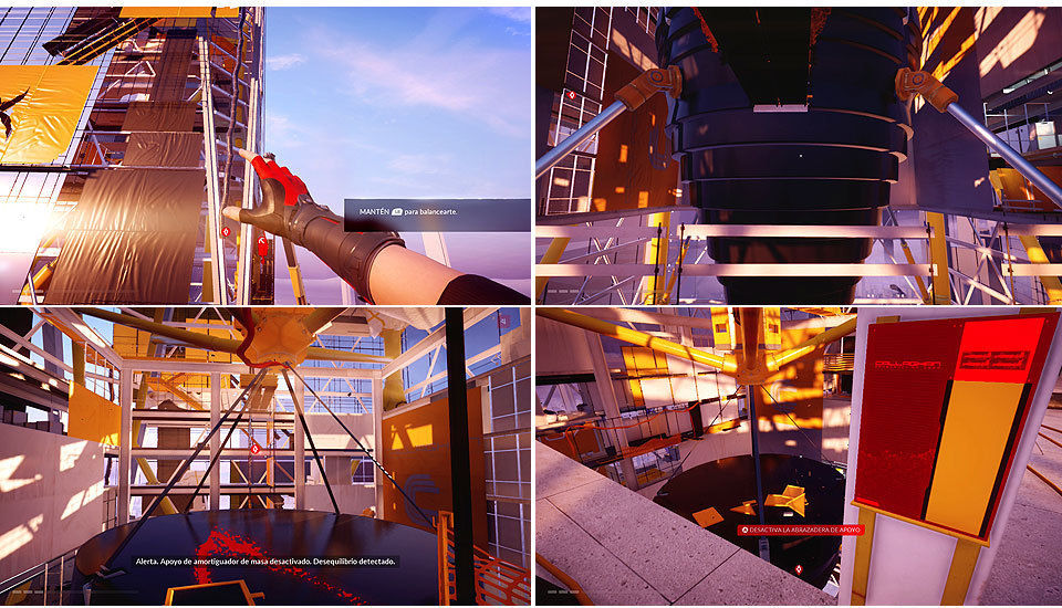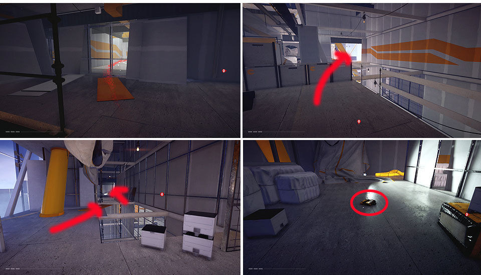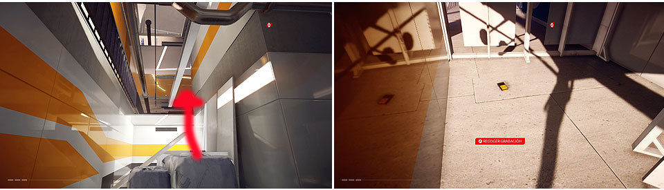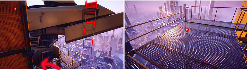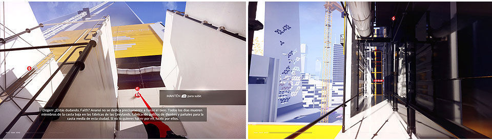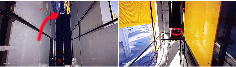 Tras recoger el coleccionable, salimos al exterior, Faith se preocupa por como afectará a los empleados el amortiguador de masa y hay que encontrar la manera de evacuar a los empleados. Por la derecha podemos usar el Gancho para continuar hasta el otro lado y usando el giro rápido podremos seguir subiendo y llegar hasta lo alto del montacargas donde nuevamente usando el gancho llegaremos a una zona elevada en el otro lado.