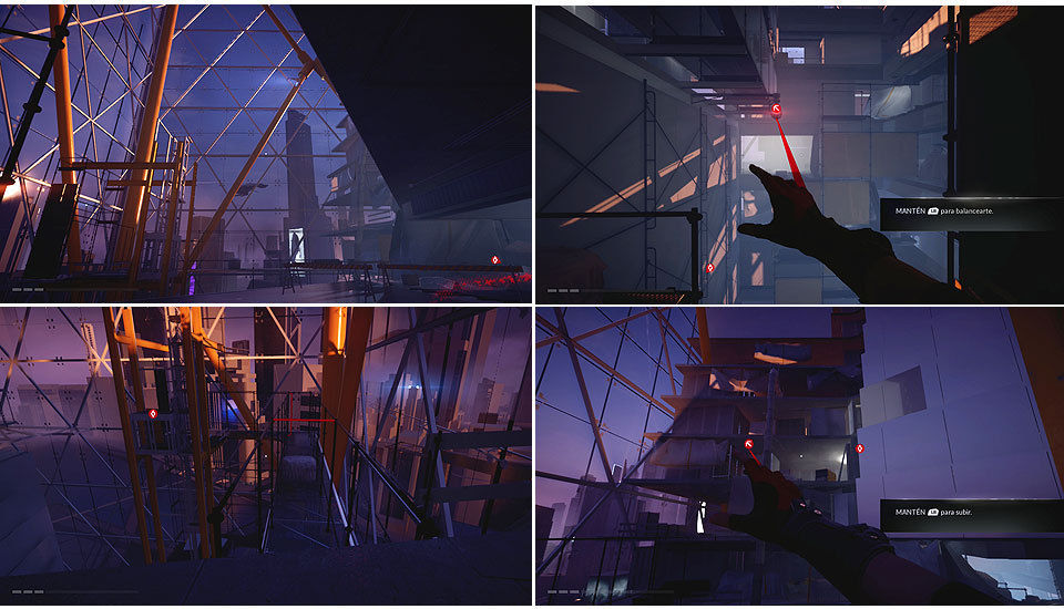 Tras aceptar la misión hay que subir hasta arriba del edificio, usamos el Gancho MAG para iniciar la subida y llegar a una zona en obras, aquí al fondo necesitamos el giro rápido para poder subir y continuar.
