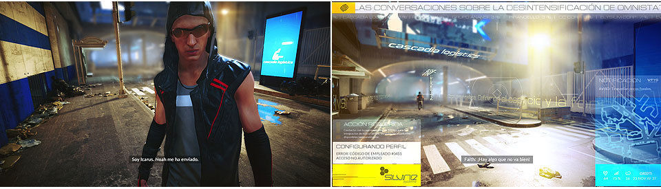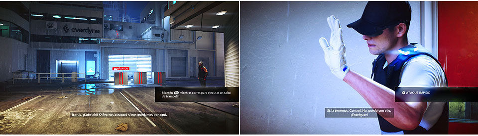 Tras este pequeño tutorial, comenzamos otro por dentro de un almacén, aquí aprenderemos velocidad, y a correr por las paredes y utilizar esto para llegar a zonas elevadas. Cuando lo completemos y salgamos del almacén nos reunimos con Icarus, tenemos que llegar hasta la torre Everdyne.
