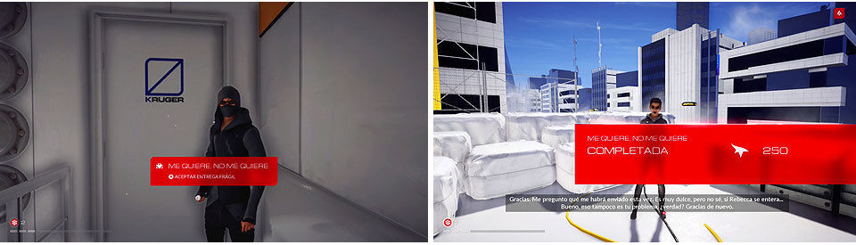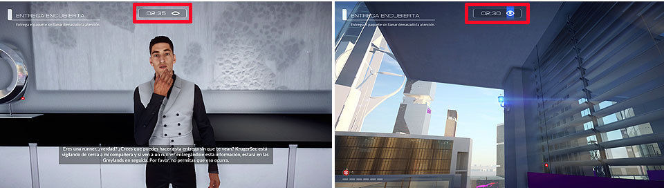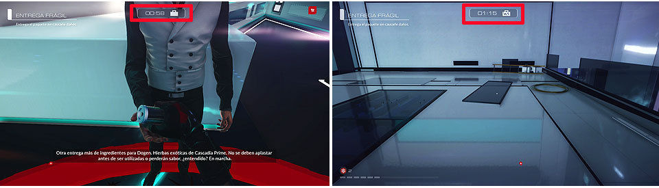 En estas entregas tenemos que llevar un paquete frágil, arriba al lado del tiempo veremos un maletín y por cada golpe que nos demos veremos una fractura sobre él, esto sucede cuando fallamos en los saltos. Por ejemplo sin hacer la voltereta o en caídas altas, también especial cuidado con pelear, cada golpe que demos a un guardia nos añade una fractura al paquete, si la entrega sufre 3 golpes fallaremos la misión y habrá que reiniciar.