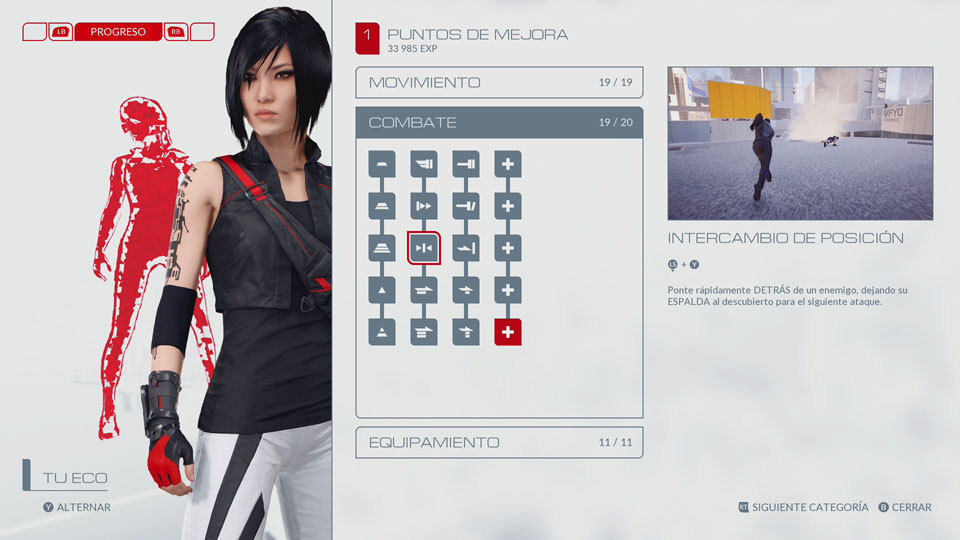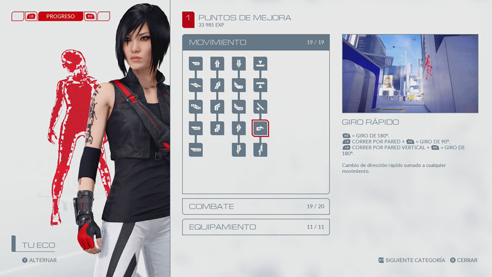 Si lo pulsamos justo cuando vamos a caer tras un salto alto, evitaremos el impacto contra el suelo, esto es importante en todas los objetivos secundarios para evitar perder tiempo y evitar que se nos rompan las entregas frágiles. Podemos hacer una mejora para realizar la Voltereta en la que pulsando LT/L2 Faith dará una voltereta al caer que nos permitirá salir usando el impulso.