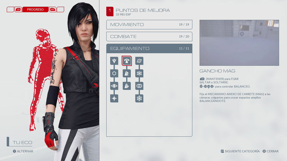 Aparte de lo que viene de serie, enlace, mapa del Beat y Micro de Vigilancia K-Sec que nos permita mostrar los datos en las persecuciones. Tenemos el Gancho MAG que lo podemos desbloquear en la misión "Erudito Extraordinario" este mecanismo nos sirve para balancearnos y cruzar espacios amplios. Tiene 2 mejoras, subir con el Gancho Mag que nos permite subir hasta posiciones elevadas enganchándonos con él y el Tirón que nos permite atrapar objetos y tirar de ellos a distancia, por ejemplo para bajar escaleras o quitar obstáculos.