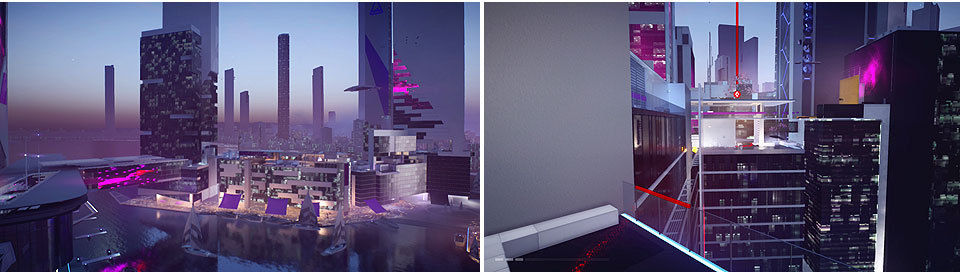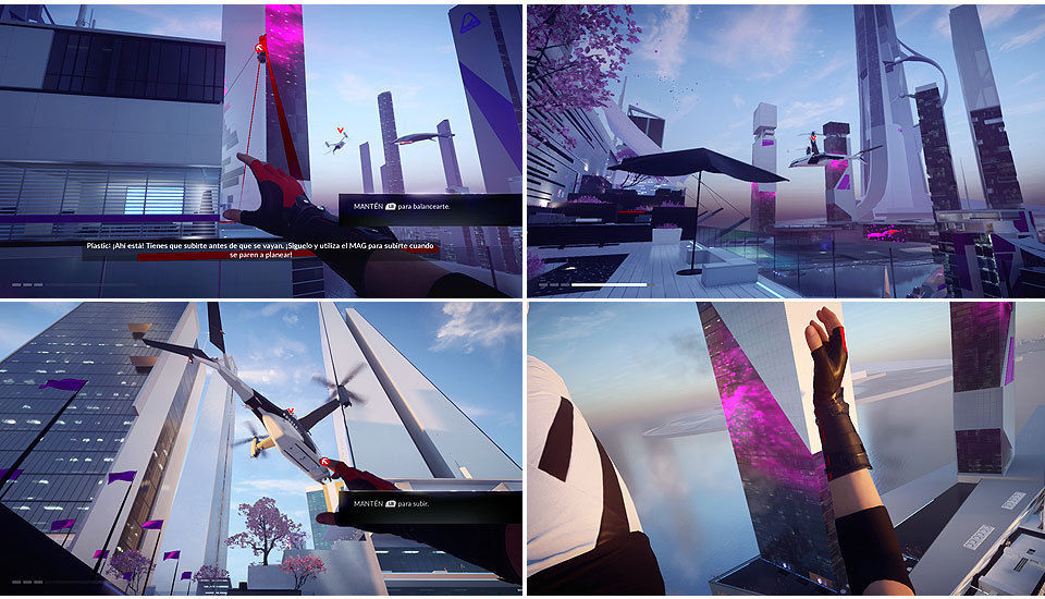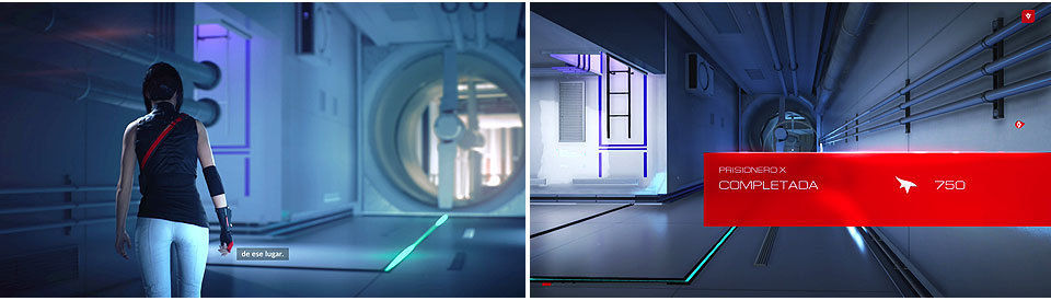 Desde la posición de la Grabación veremos arriba a la izquierda una pasarela: hay que saltar sobre la barandilla, correr por el cristal y saltar para llegar a ella donde encontraremos la Bolsa Secreta. Si continuamos corriendo por el cristal y saltando llegaremos hasta la puerta de la otra torre, hay que aguantar la máximo la carrera por el cristal para llegar al otro lado (si no siempre podemos volver hacia atrás y hacer el camino normal).