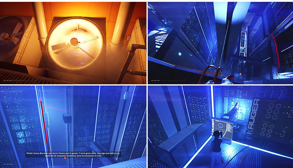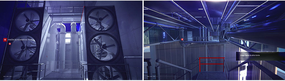 Tras recoger los coleccionables avanzamos por la puerta que nos lleva al interior de la otra torre, cogemos un ascensor y llegamos a la zona de los ventiladores, uno de ellos se apaga intermitentemente para poder deslizarnos y entrar en el servidor.