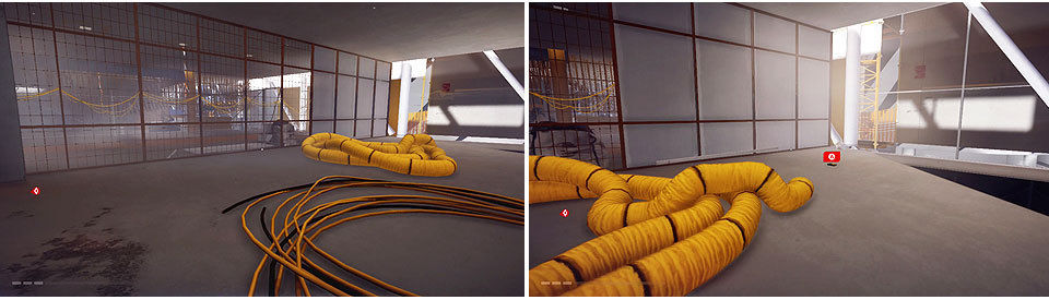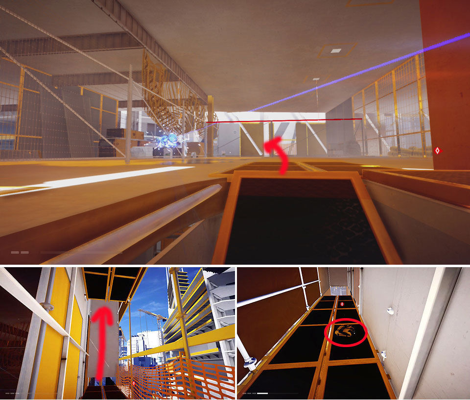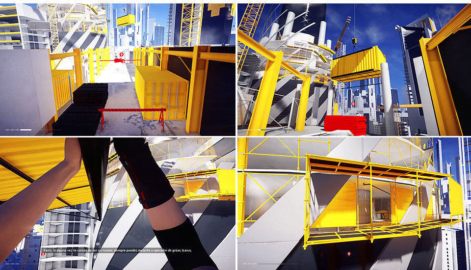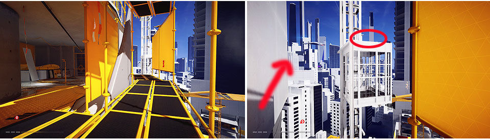 Avanzamos por el hueco en la pared de la izquierda y continuamos por el conducto, saldremos a otra zona igual que la del edificio anterior. Hay que correr sin parar evitando los disparos de los drones y muy pendientes de los saltos. Igual que antes tenemos tuberías para girar rápido, saltos por muros y deslizamientos. Cuando lleguemos a la azotea, Icarus nos pide que saltemos hasta el gancho de la grúa y que soltemos la carga para destruir a los drones. Ya solo queda bajar hasta abajo gracias a la ayuda de Icarus y la misión concluye.