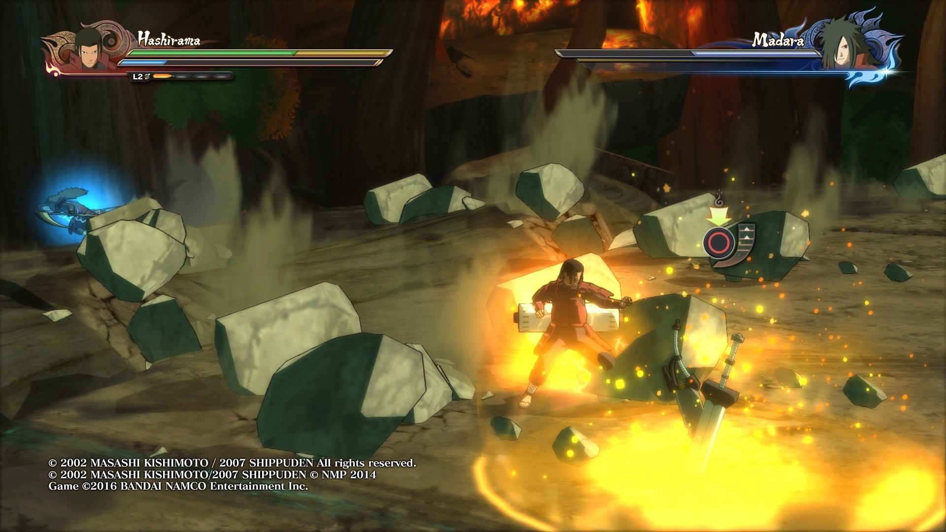 Controlas a Hashirama y tienes que enfrentarte a Madara. La batalla empieza normal, pero en cierto punto caerá una espada al escenario. Mantén pulsado círculo para cogerla y aumentar tu poder de ataque.