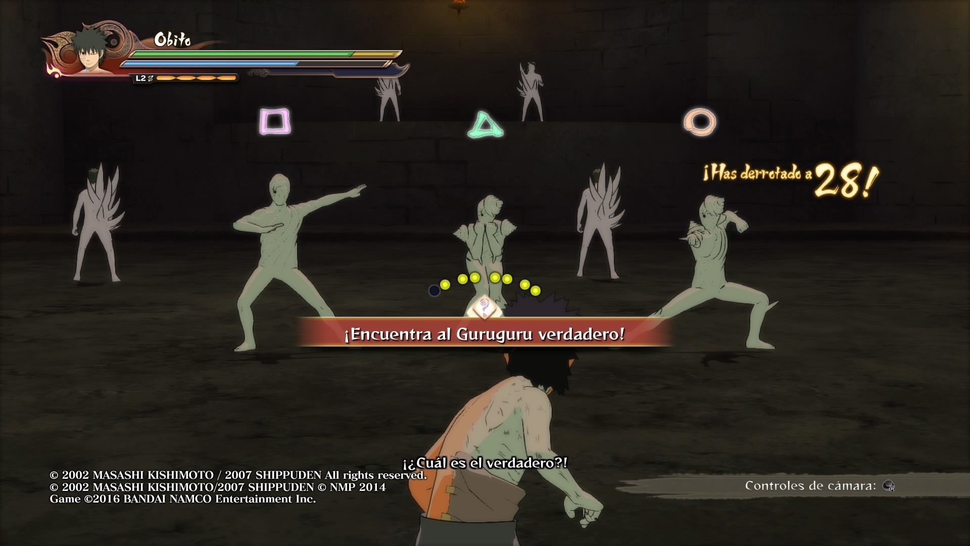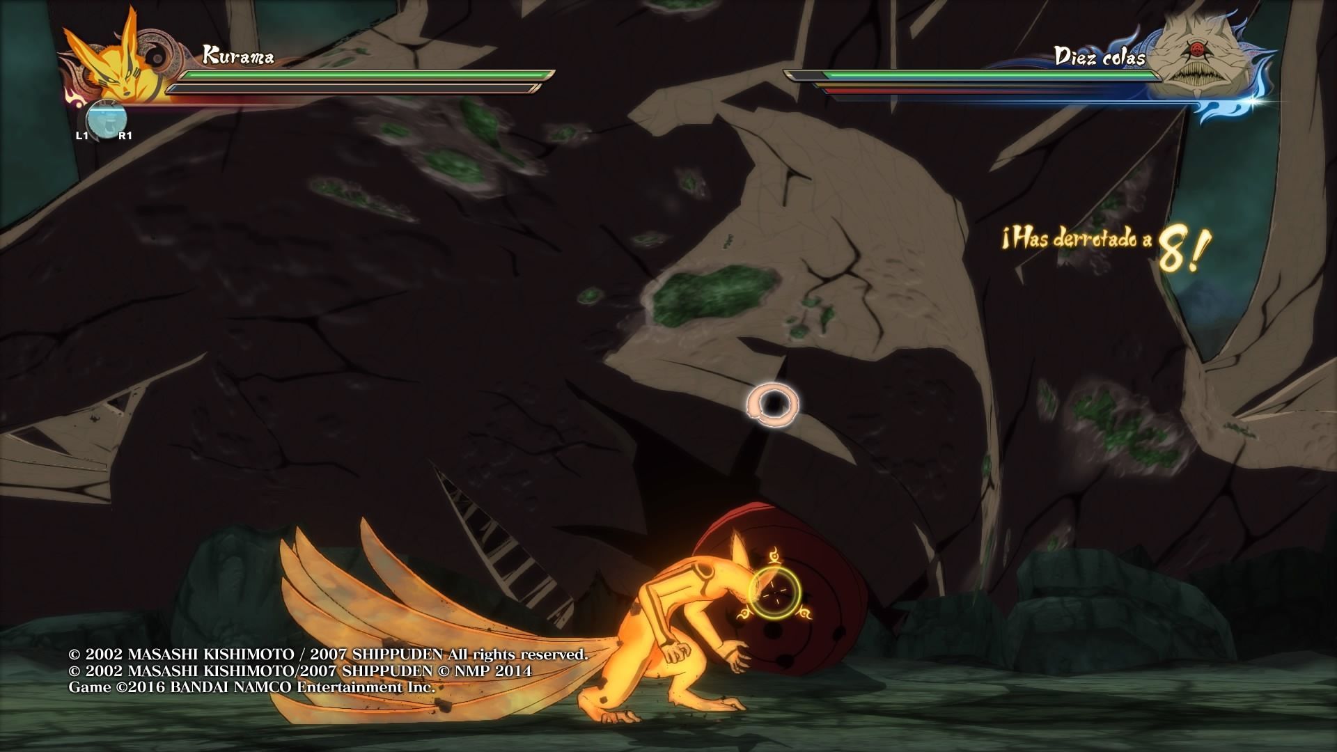 En este combate tomarás el control de Kurama y tendrás que fijar tu objetivo en los ojos del diez colas. Usa el stick derecho para cambiar de objetivo, dispara con cuadrado y mantén pulsado para cargar un ataque más poderoso. También puedes pulsar triángulo + cuadrado para lanzar una bomba dispersada y dañar a varios objetivos a la vez.