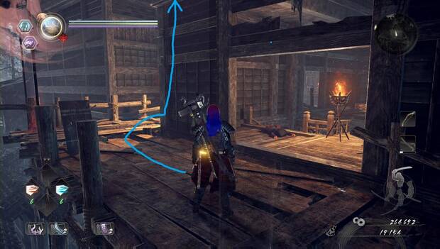 Ahora sube las escaleras y ve recto hasta la siguiente sala, donde encontrarás a un enemigo con odachi. El caso es que, al acabar con él, si te fijas, puedes ver al quinto Kodama en un lado de la habitación.