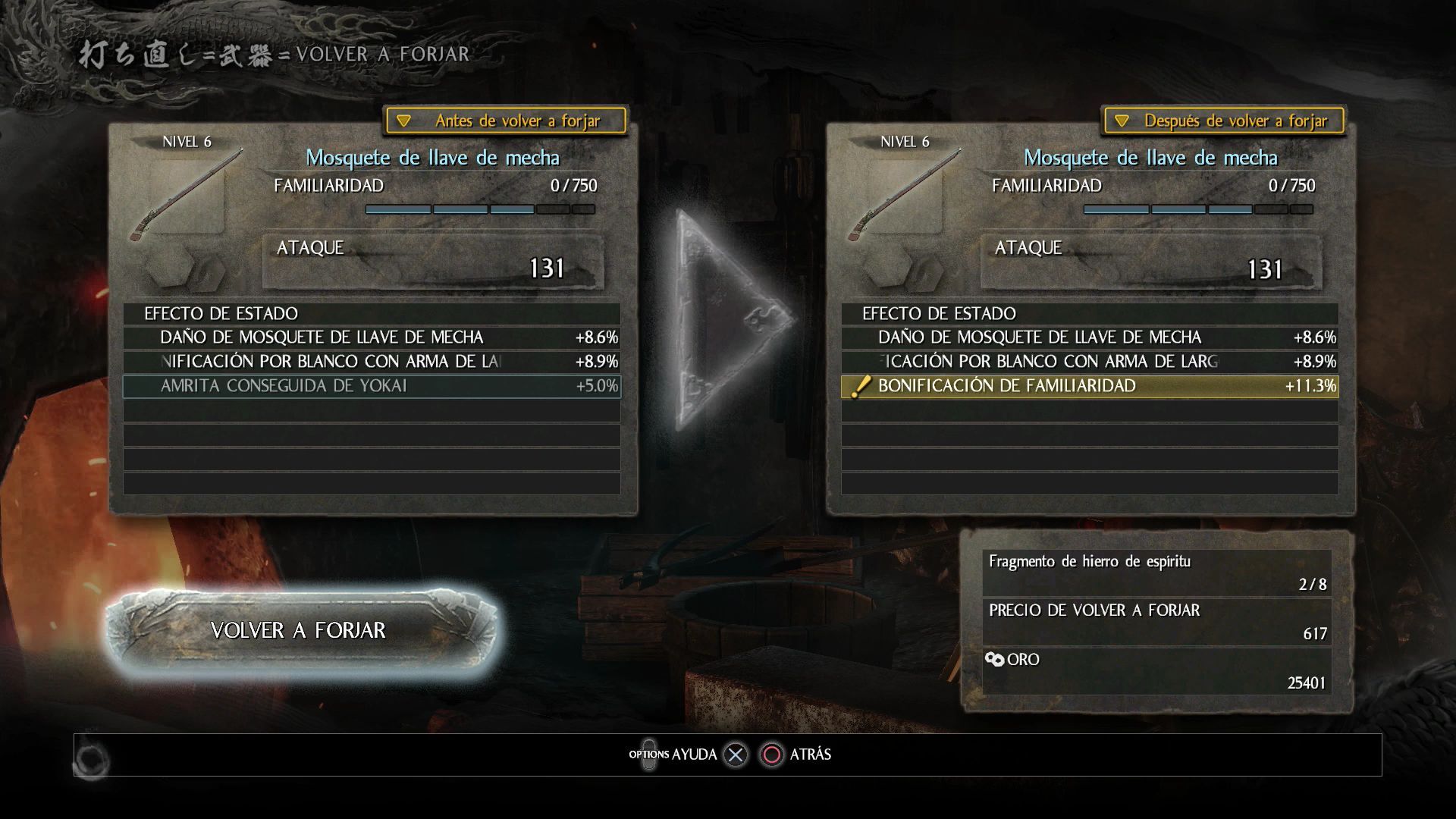 Volver a forjar: Esta opción te permite modificar los efectos no heredados de tus armas y armaduras. Para cambiar los efectos te harán falta Fragmentos de hierro de espíritu y oro. Ten en cuenta que el efecto que consigues al forjar es totalmente aleatorio.