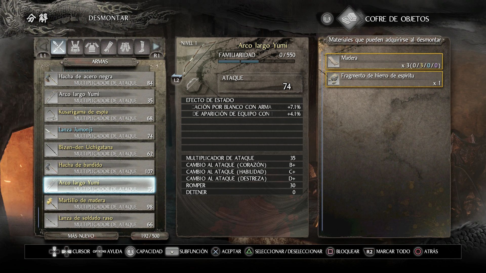Desmontar: Esta opción te permite desmontar cualquier arma o armadura para conseguir los materiales con los que está construido. El propio juego te indica los materiales que consigues al desmontarlo y dependiendo de la calidad del objeto serán mejores o peores materiales los que consigas.