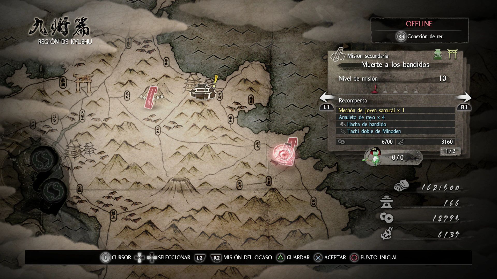 Recompensas al completarla por primera vez: Mechón de joven samurái x1, Amuleto de rayo x4, Hacha de bandido, Tachi doble de Minoden. 6.700 de oro y 3.160 de amrita.