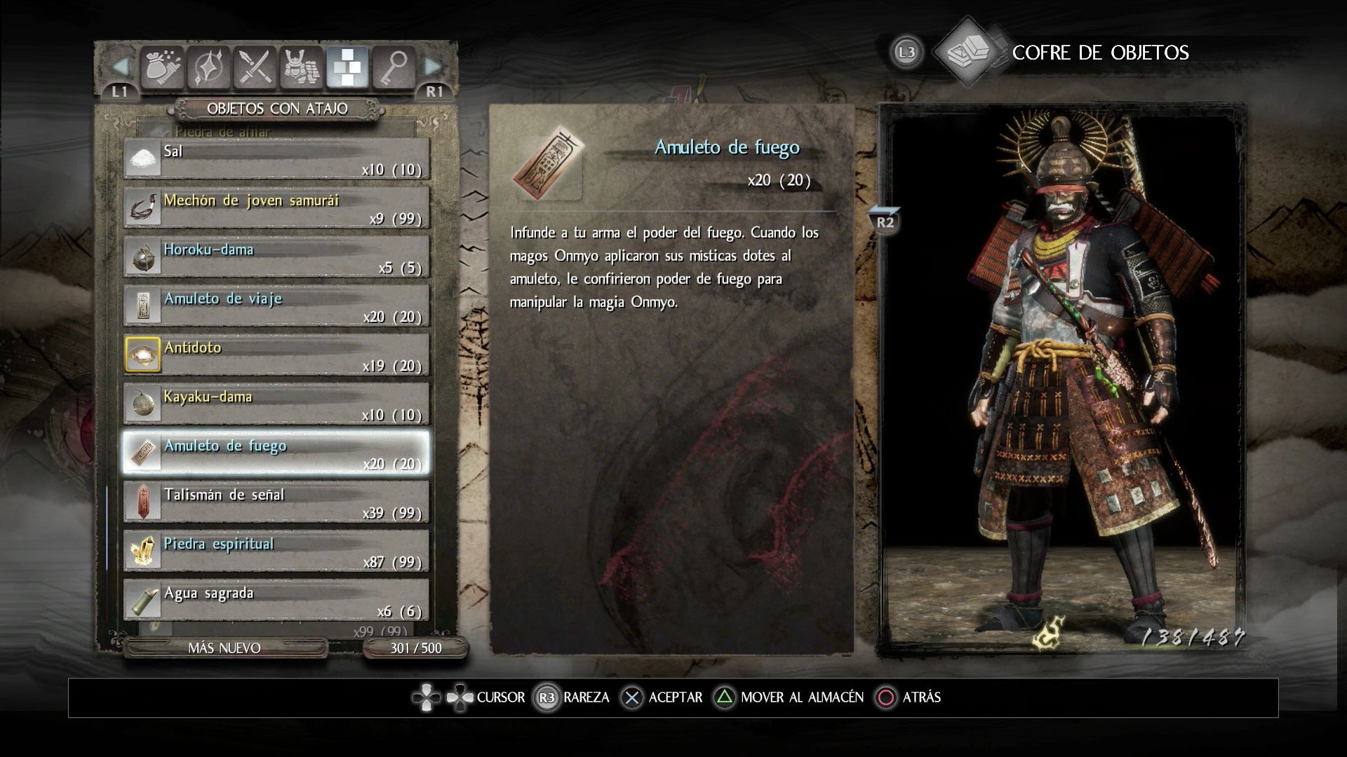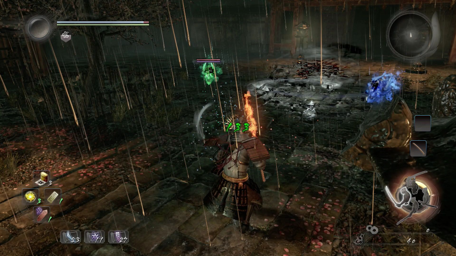 En Nioh contamos con la posibilidad de añadir un elemento a nuestro arma de tipo fuego, agua, rayo y viento. Al añadir este elemento a nuestra arma conseguiremos daño extra en nuestros ataques en mayor o menor medida teniendo en cuenta la debilidad del enemigo en cuestión.