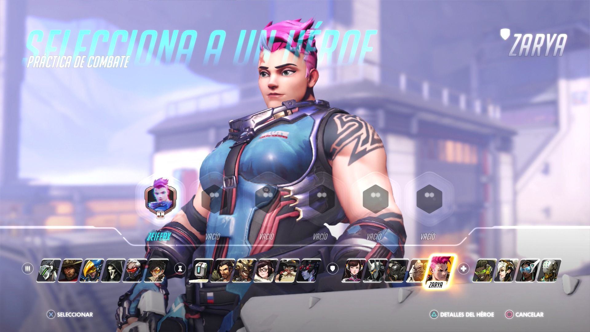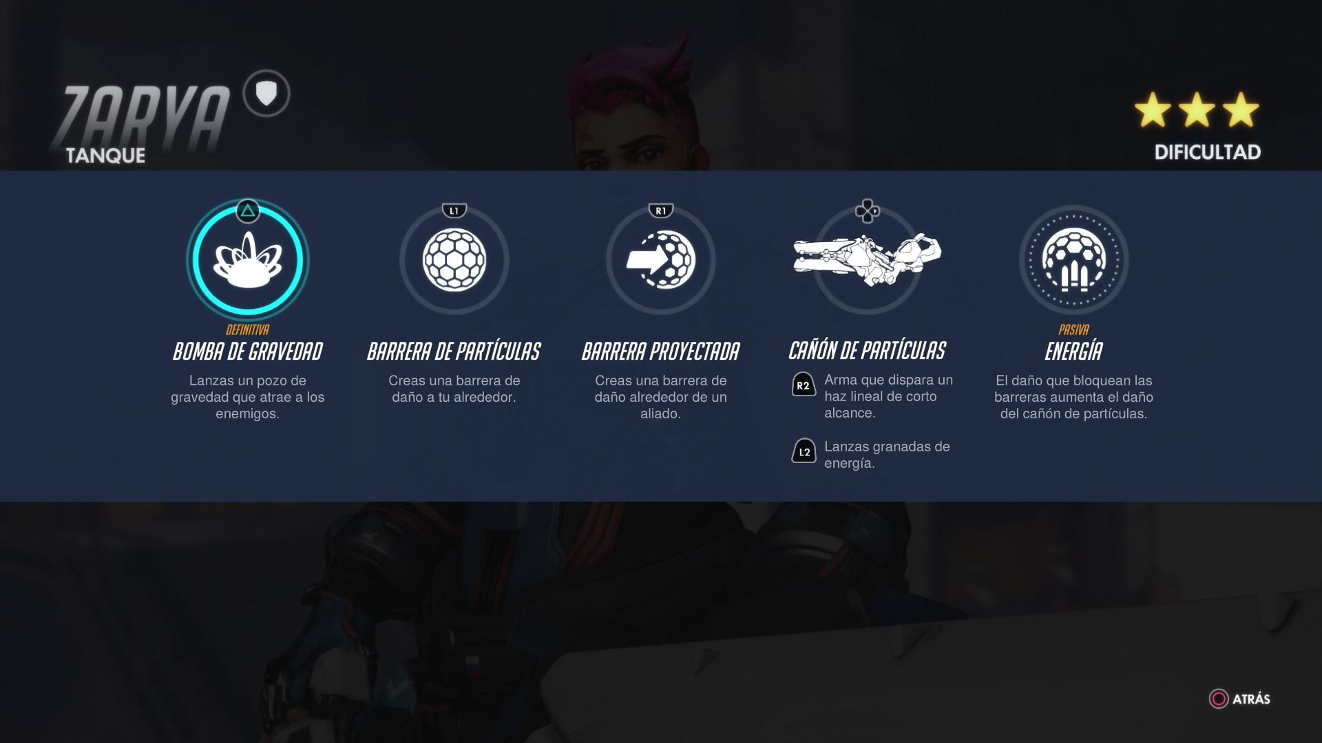 El arma de Zarya tiene dos ataques diferentes. En uno de ellos dispara un haz lineal de corto alcance y en otro lanza unas granadas de energía en arco. El haz lineal gasta la munición según tengamos pulsado el gatillo y en el caso de las granadas gastará un total de veinticinco balas con cada una de ellas. Debes tener cuidado con las granadas porque a ti también te hacen daño.