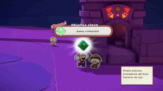 Después de completar la Cueva del Fuego y obtener el poder del papelemental de fuego tendrás que resolver otro puzle que está relacionado con los cuatro torreones con forma de Toad que hay repartidos por los desiertos. A estos torreones les falta una gema en uno de sus ojos. El primer torreón ya sabes que está aquí mismo, en el Gran Desierto de Lija. Ve hacia él y antes de subir a su interior, fíjate en que su pie izquierdo tiene un pequeño rombo grabado en la piedra.