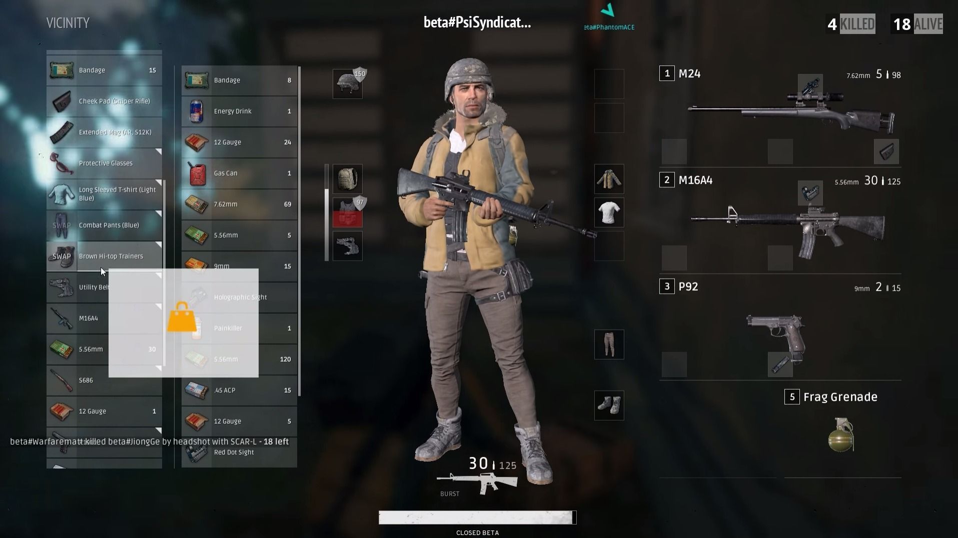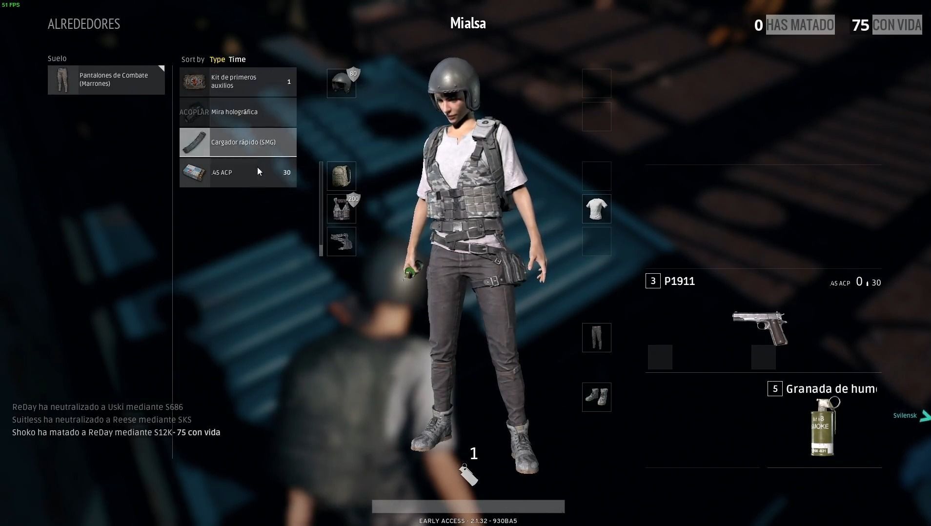 A la derecha de nuestro personaje aparece una nueva columna para la ropa, pudiendo ver la camiseta, el pantalón, las botas o los complementos que llevamos puestos. Por último, en la parte derecha de la pantalla tendremos las armas disponibles (del 1 al 4) y la granada (5). Además, según el arma existirán distintos huecos grises que nos indicarán que puede utilizar complementos para mejorar su rendimiento.