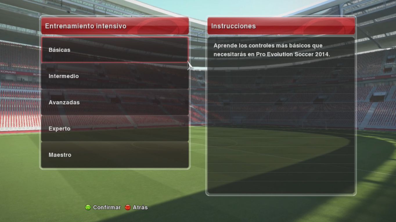 Konami es conocedora de todos los cambios respecto a la edición anterior, así que nos van a sugerir desde la pantalla de menús que pasemos a visitar el modo entrenamiento. En esta ocasión se trata de un modo guiado llamado "Entrenamiento intensivo", dividido por niveles y con su propio tutorial correspondiente. Vamos a repasar qué pruebas nos piden que realicemos y a comentarlas por encima.