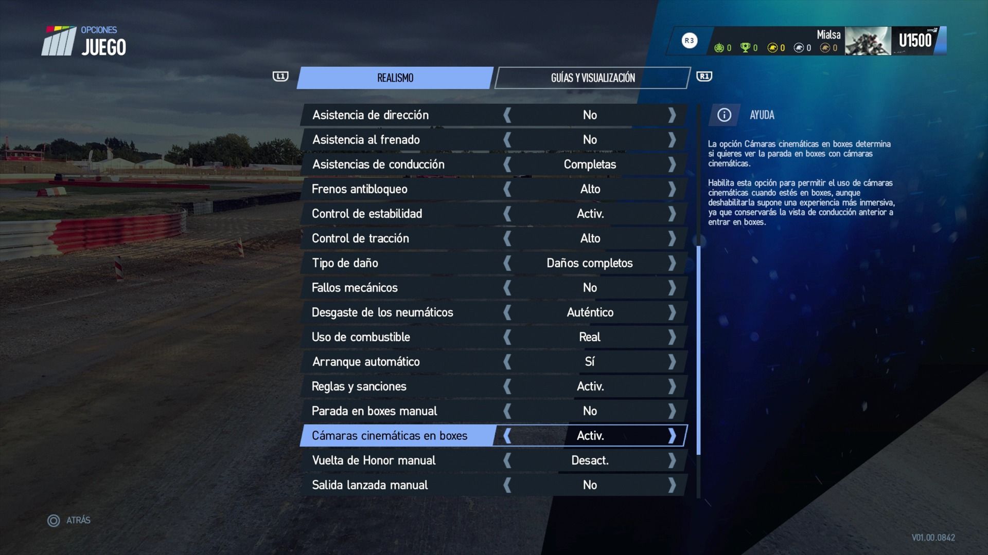La opción de parada en boxes manual determina si mantienes el control del coche en la calle de boxes y durante la parada, por lo que tendrás que entrar, parar y salir. Habilita esta opción si quieres asumir el control completo del vehículo. Si se queda deshabilitada, no tendrás control manual del vehículo, el cual estará en manos de la IA hasta que salgas a la pista y vuelvas a recuperarlo.