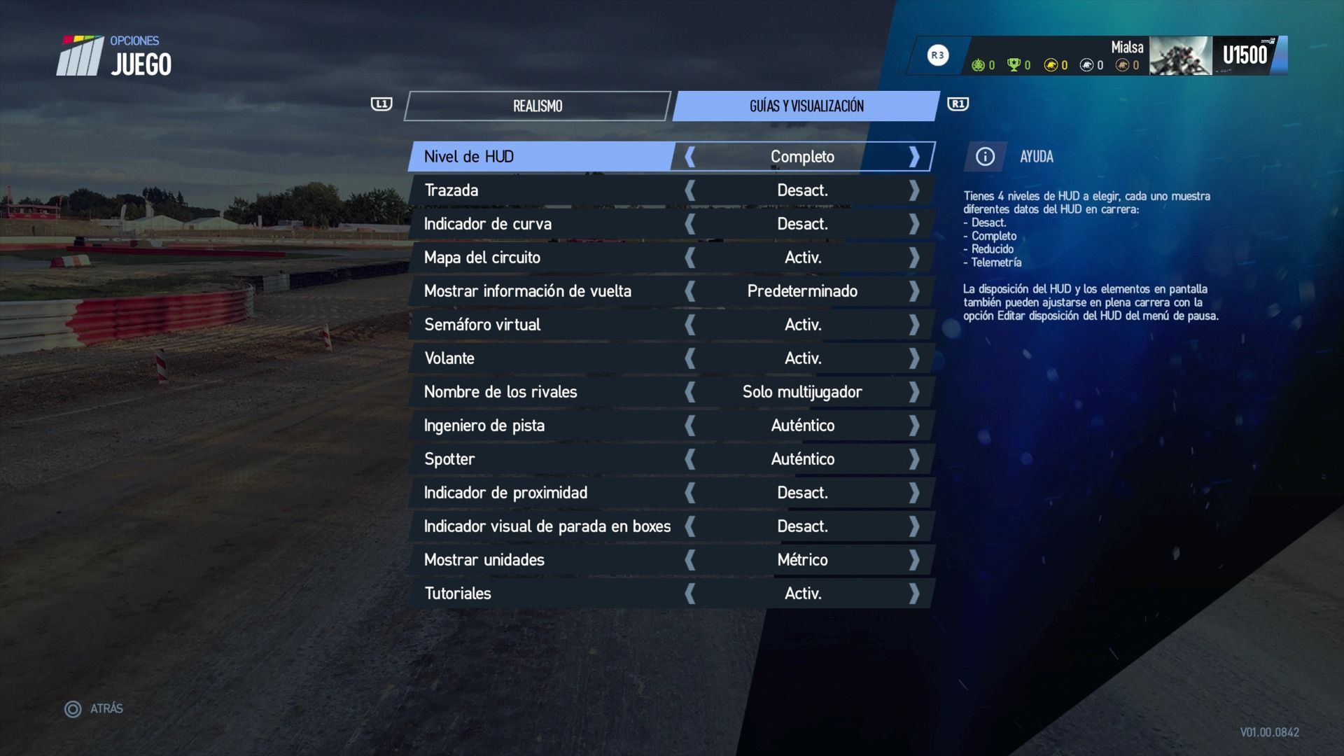 Determina la información que vamos a poder ver en pantalla durante la carrera. Existen cuatro opciones: Desactivada, Completo, Reducido y Telemetría. La disposición del HUD y los elementos en pantalla también puede ajustarse en plena carrera con la opción Editar disposición del HUD en el menú de pausa.