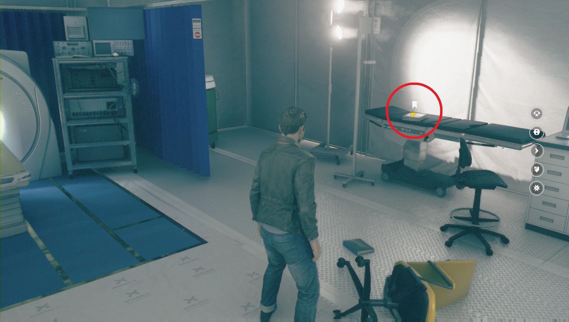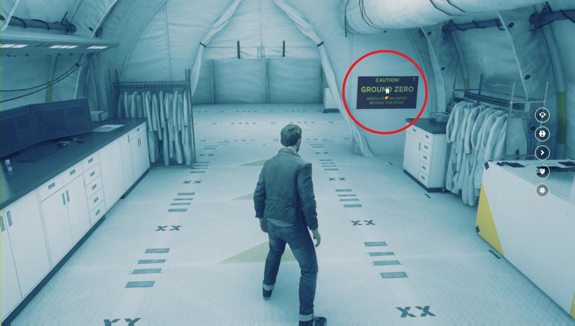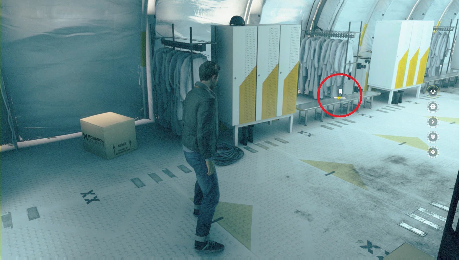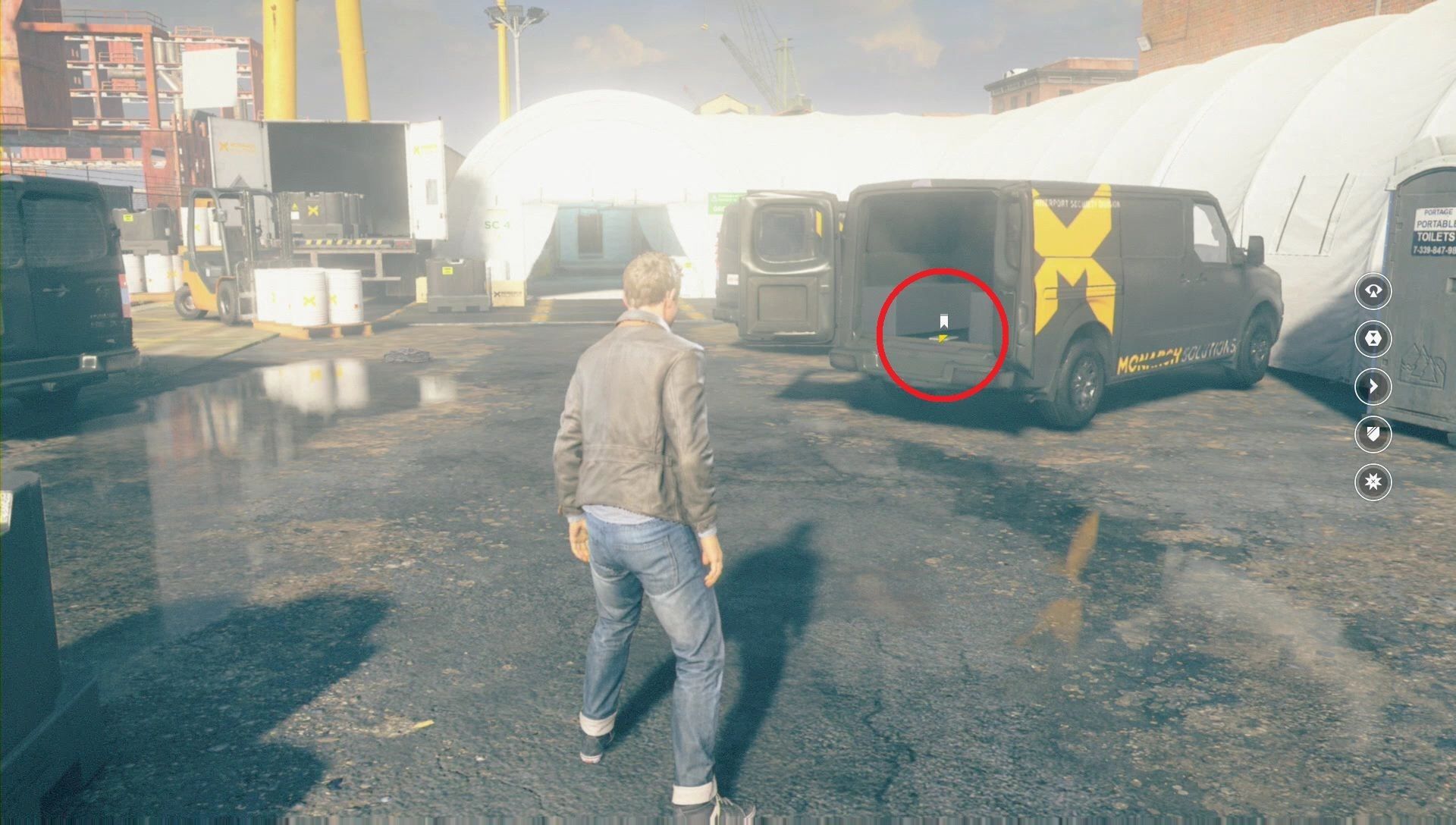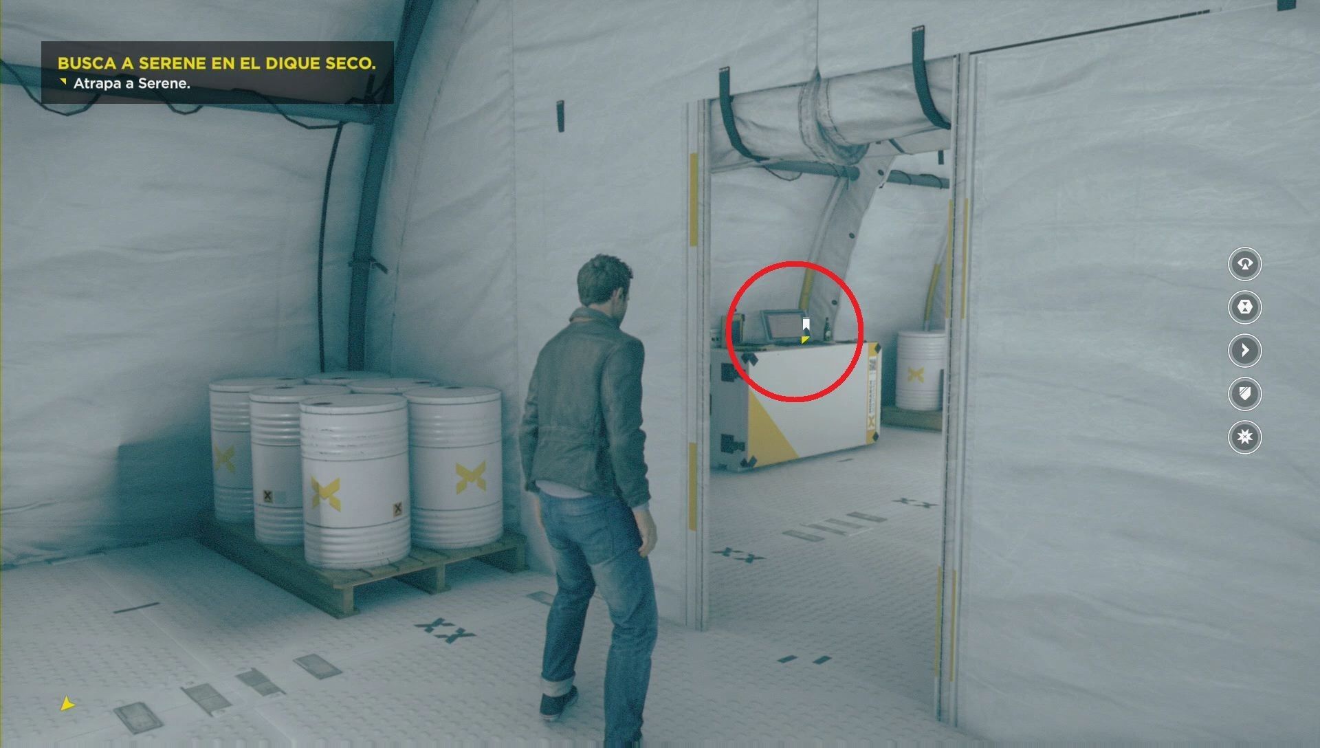 Avanza hasta que cambie el escenario, salta la valla por el contenedor y, al fondo, arranca el madero para entrar en el edificio. Muévete hasta que se despejen las escaleras. Entonces, sube y sigue el único camino. Desde la tarima, ve a la puerta abierta de la derecha y observa la pancarta de los Riverport Rexes para desbloquear una onda cuántica.