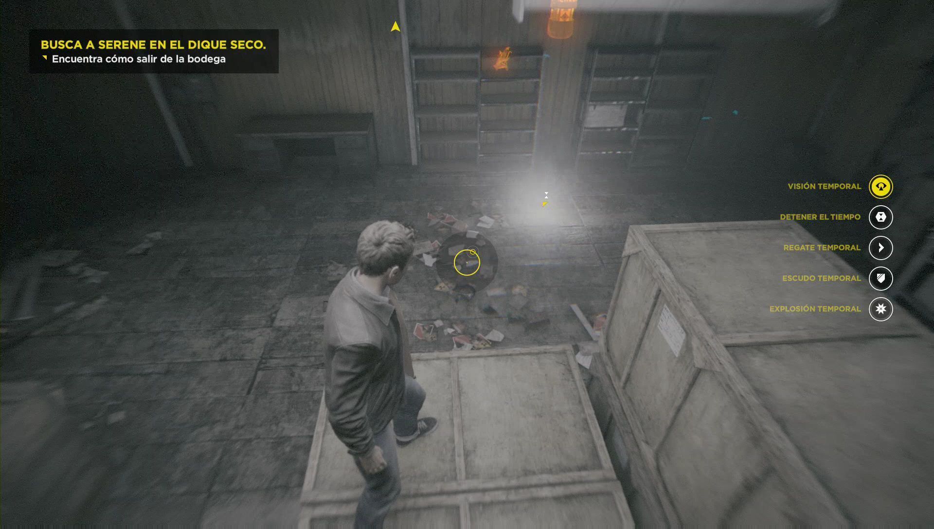 Sube, trepa por las cajas del lado opuesto y sigue adelante hasta encontrar un agujero en el suelo, cerca de la esquina. Baja para conseguir otra fuente de chronon.