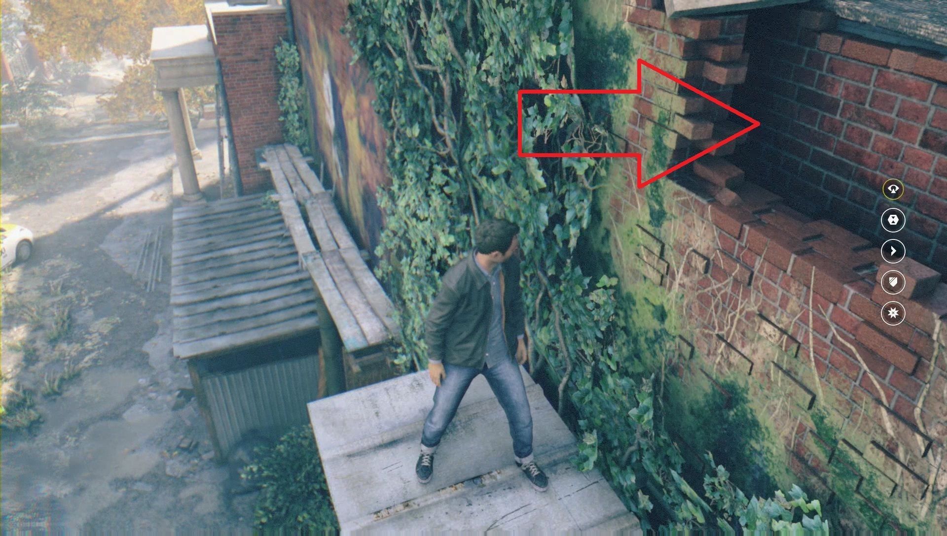 Regresa afuera, vuelve a subir por el contenedor rebobinando el tiempo y ve a la fachada principal por el andamio que hubo en el pasado.