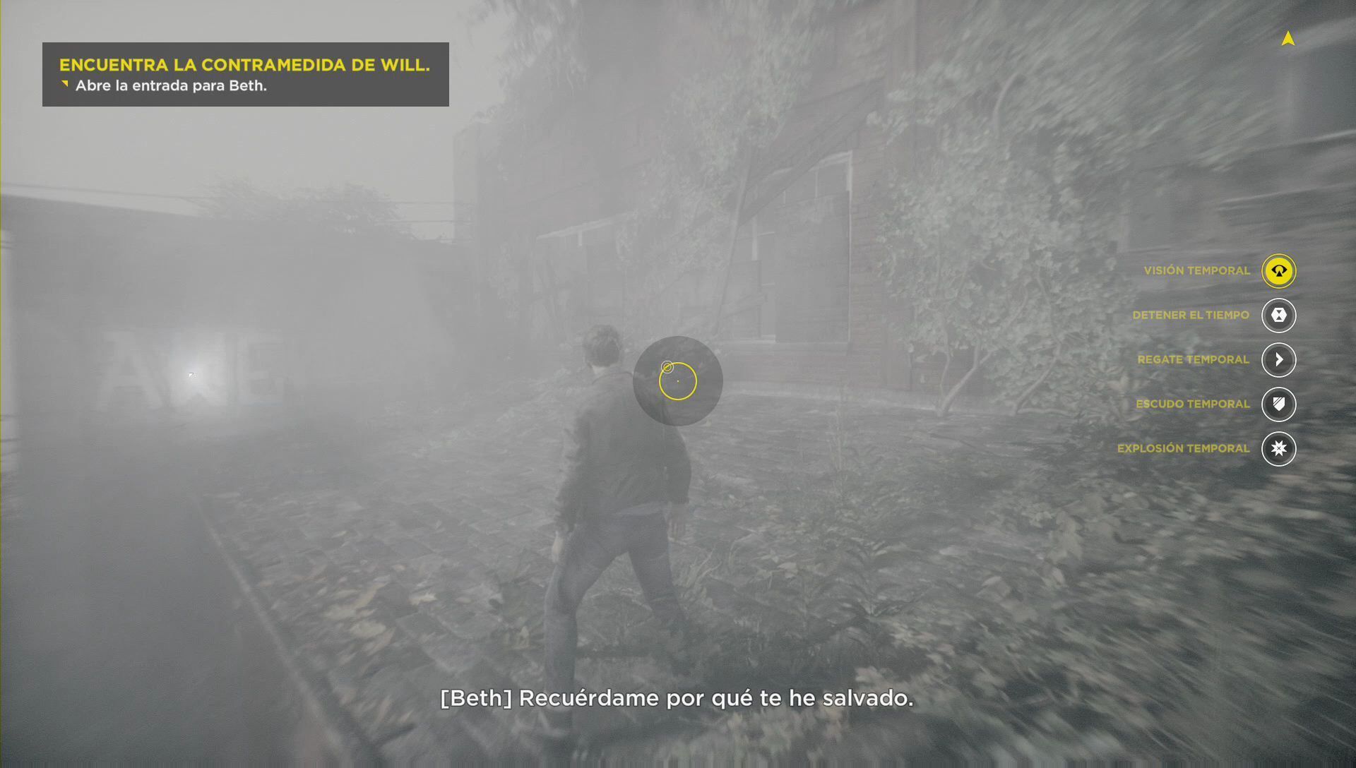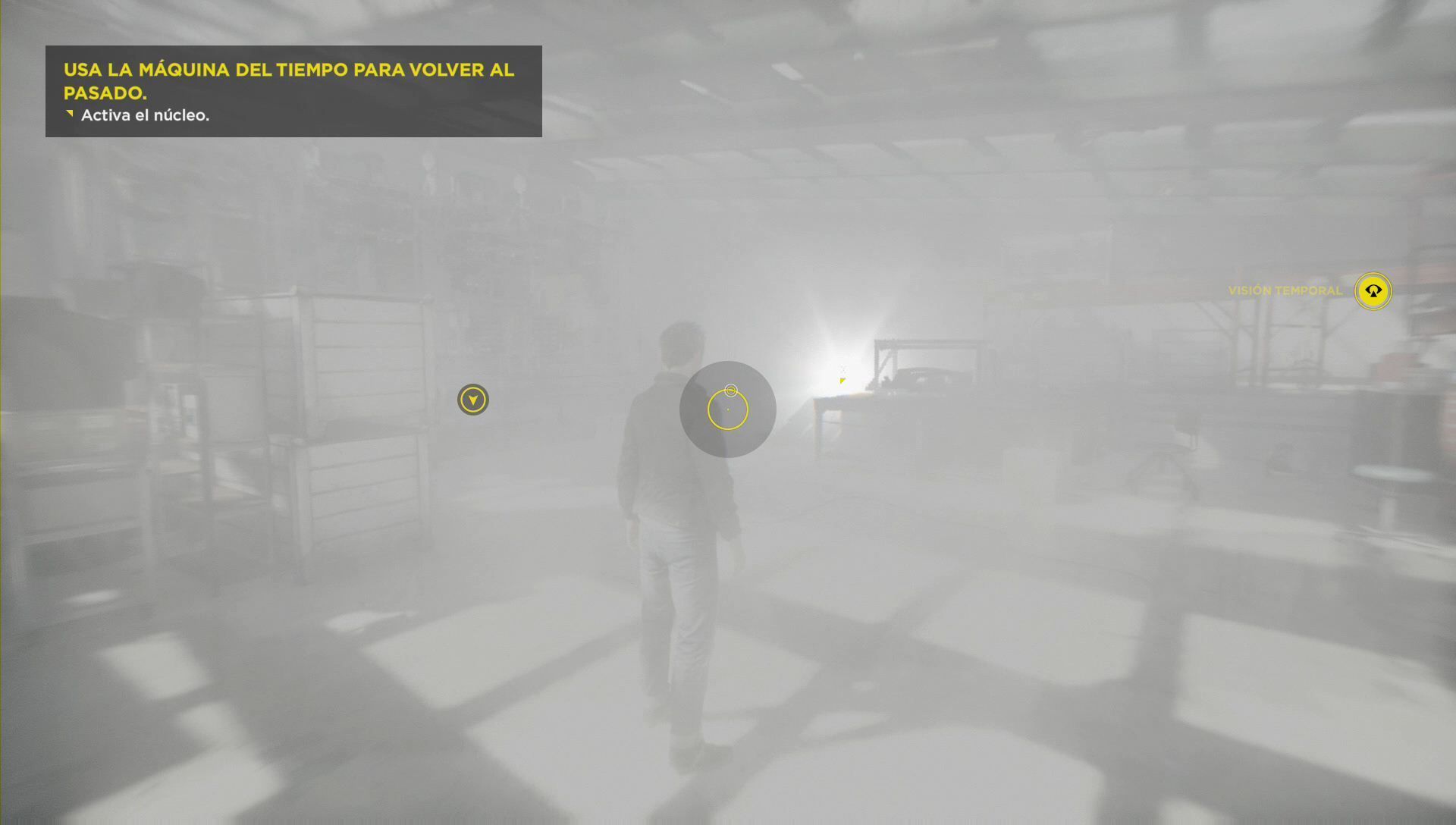 La puerta del edificio está cerrada; ve al lateral derecho, activa la visión temporal y rebobina el tiempo para poder trepar por el contenedor al tejadillo. Ponte encima de las tuberías y espera un poco a que el tiempo vuelva a su lugar. Avanza el primer madero y prepárate para correr por el siguiente en cuanto aparezca y usarlo para llegar hasta el saliente de delante. Entra y hazte con la fuente de chronon.