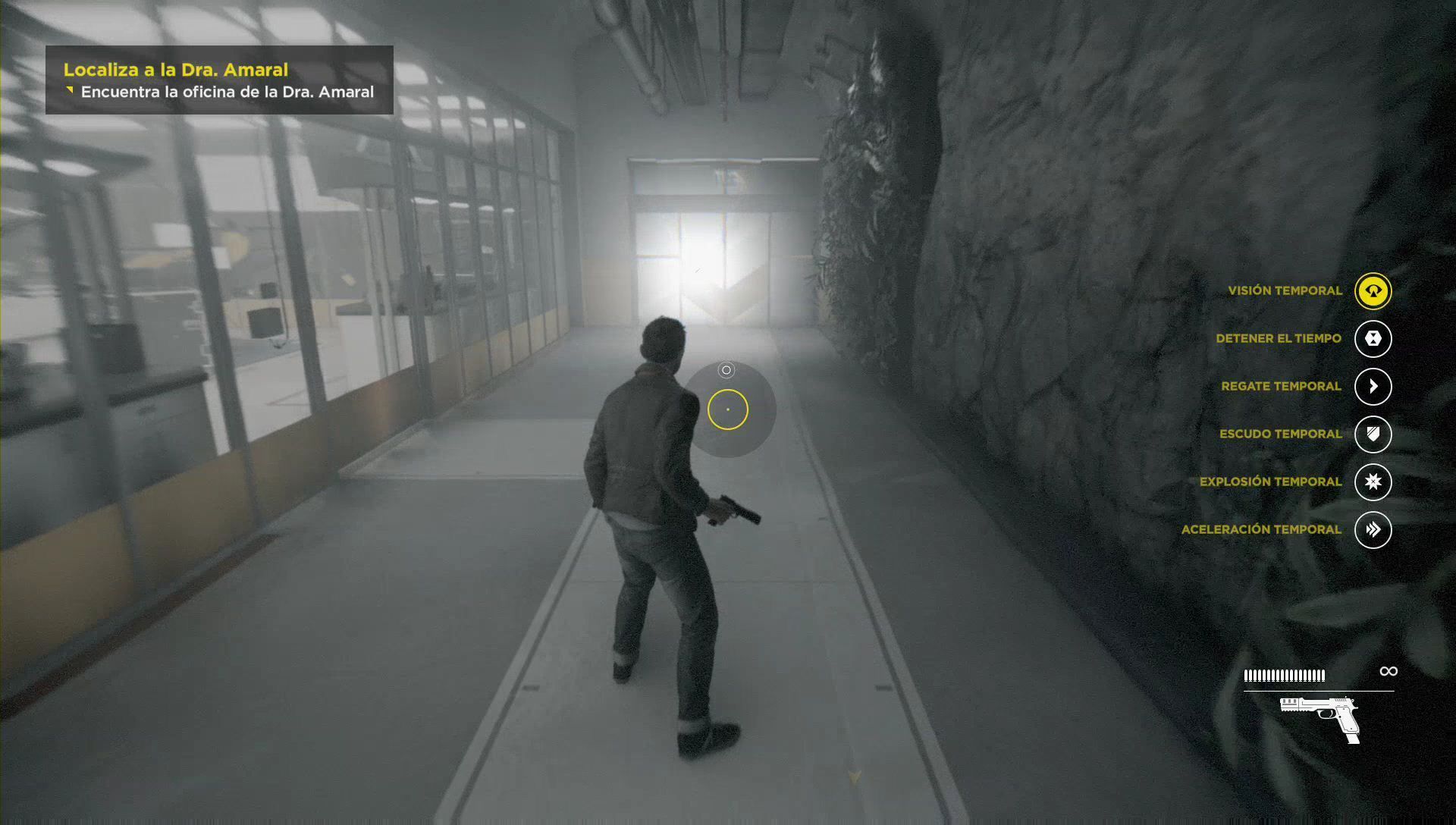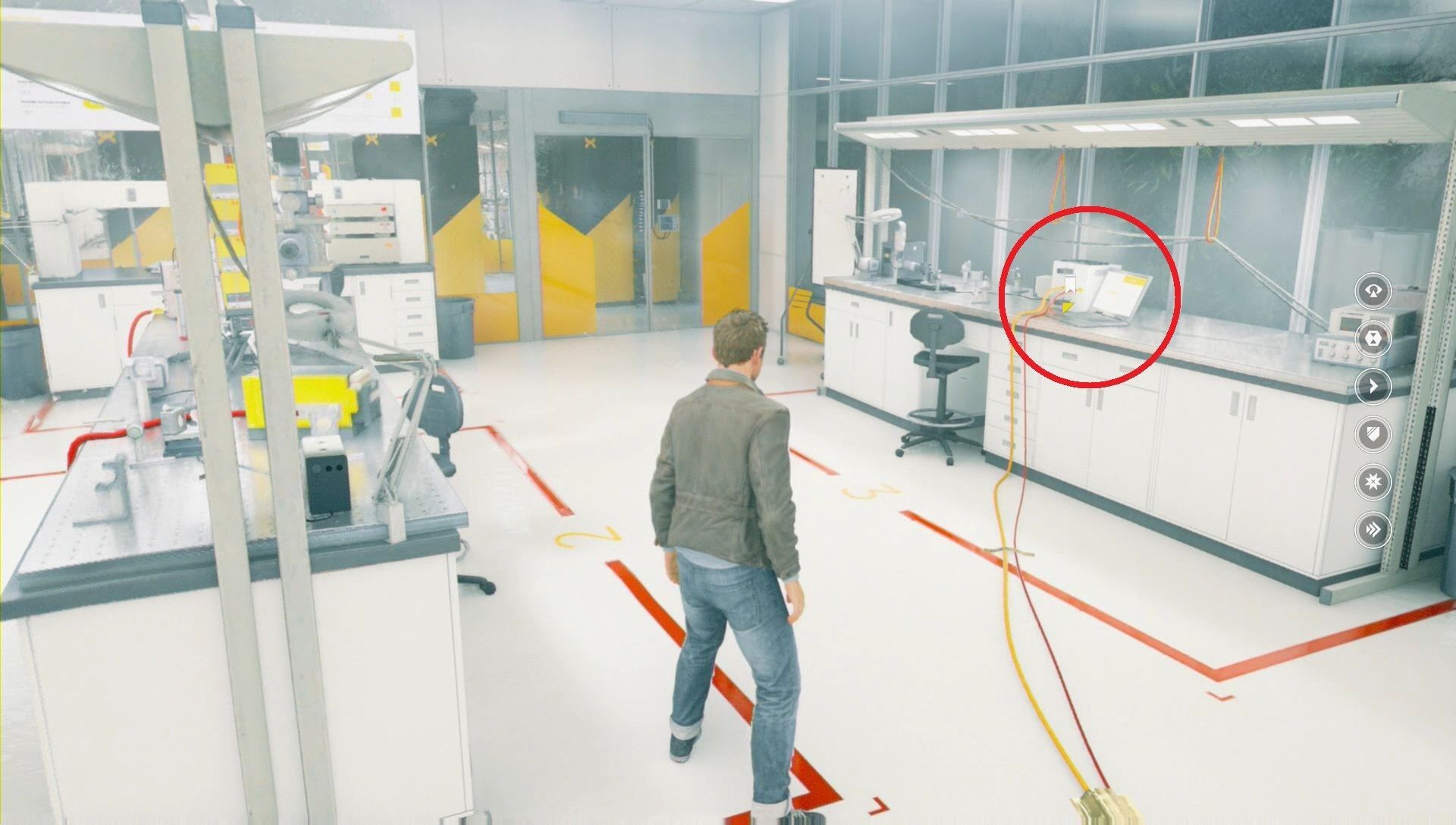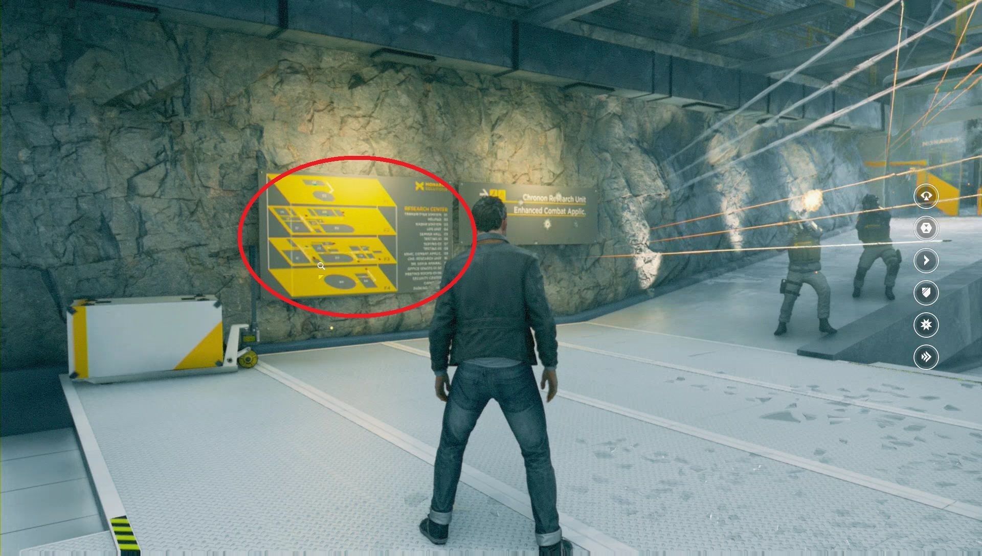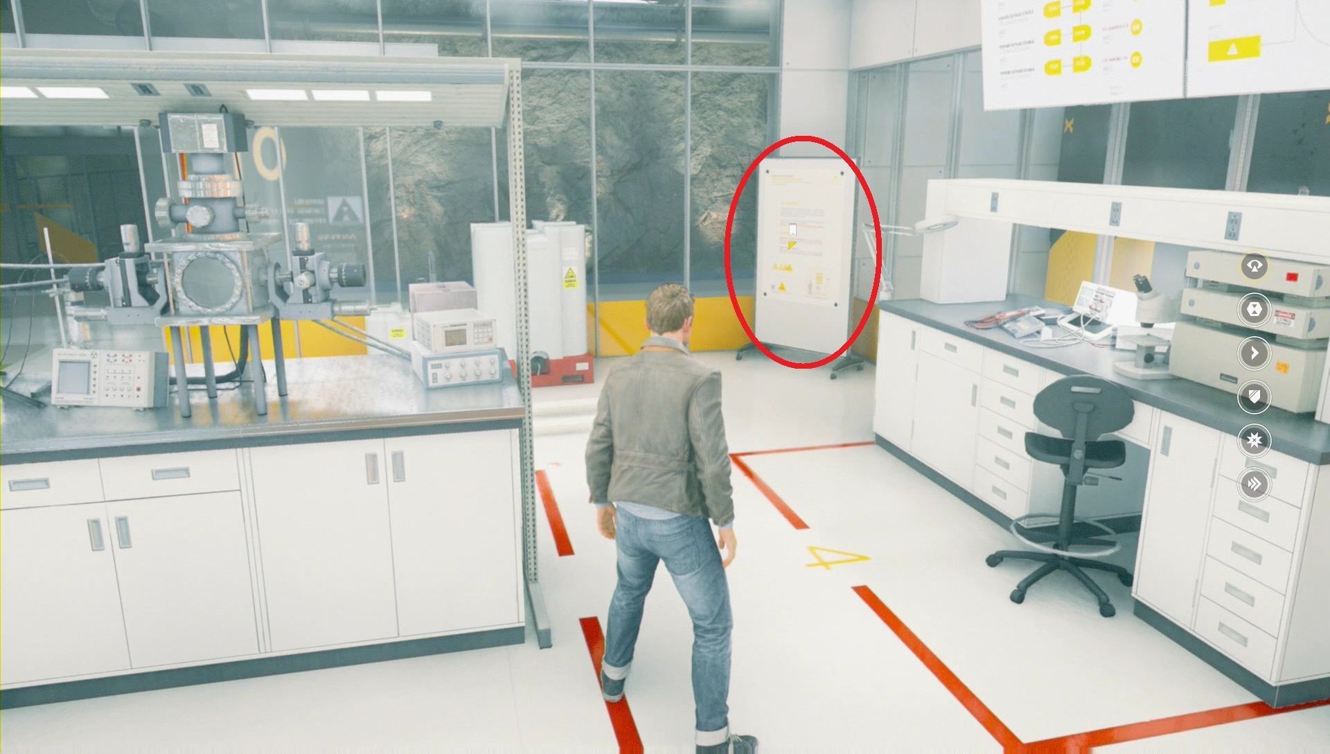 Ve al laboratorio contiguo para ver un eco del pasado. Regresa al pasillo y recoge una fuente de chronon entre los dos carteles de la pared.