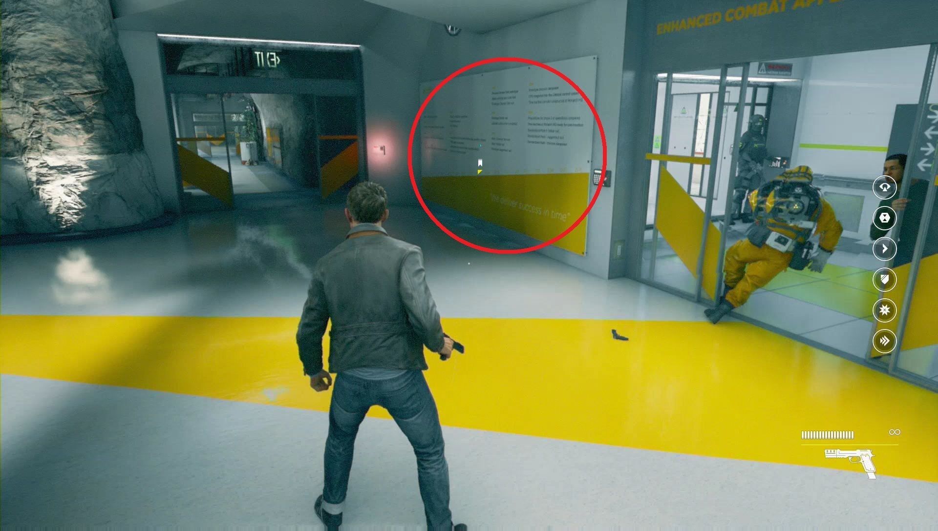 Da media vuelta y ve hasta el fondo del pasillo. Detén la puerta, pasa y liquida a los dos guardias que hay a mano izquierda. Luego examina el gran cartel con la línea de tiempo de la tecnología de Monarch.