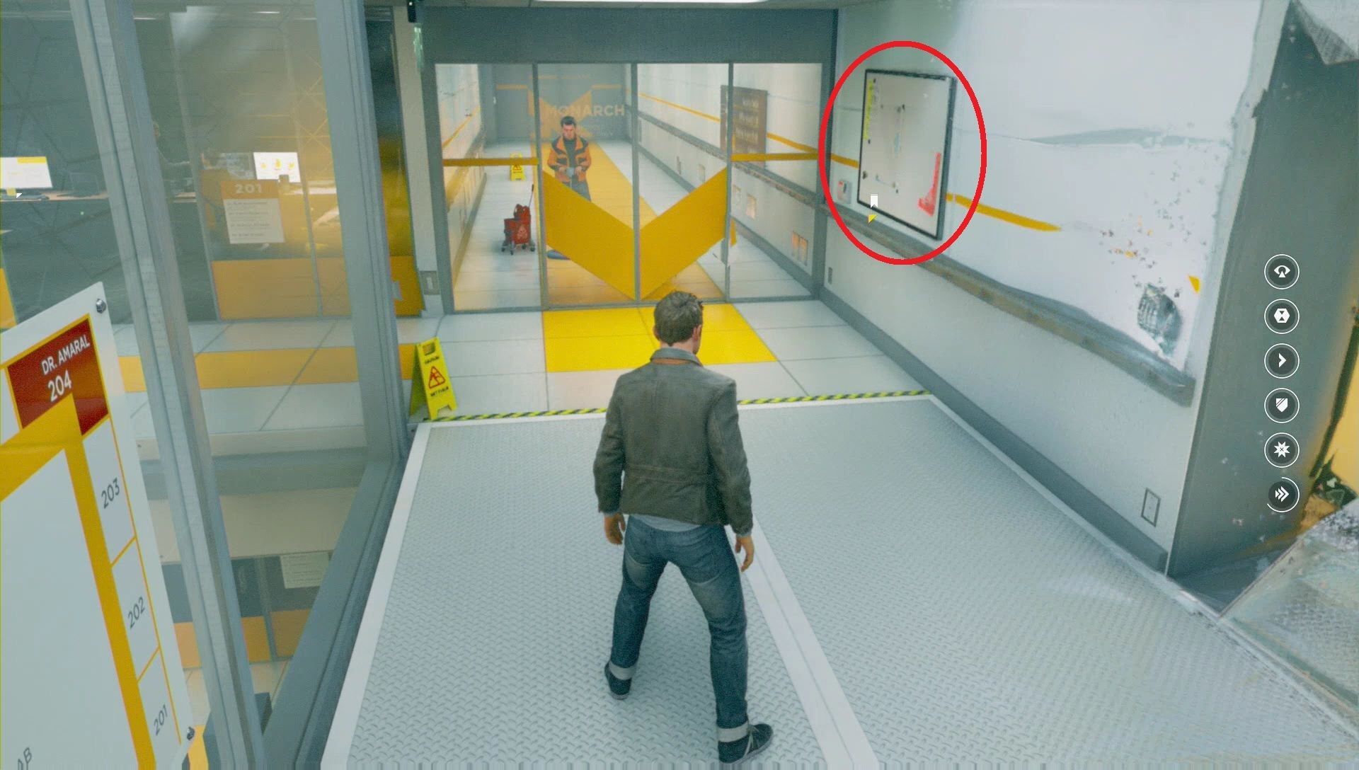 Métete en el ascensor, pulsa el interruptor y espera. Cuando sea el momento, sal de aquí y examina el cartel con el mapa del edificio de Investigación y Desarrollo.
