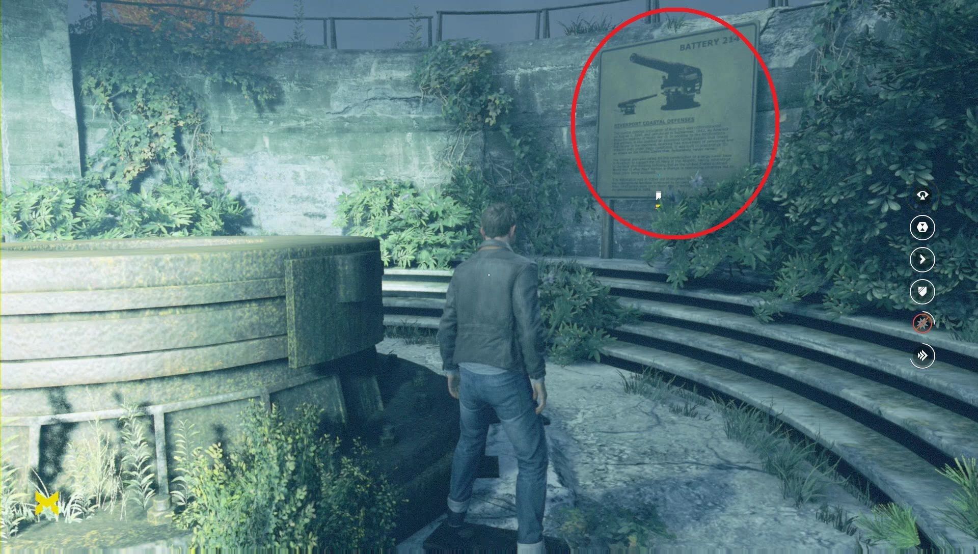 Sigue más allá de la ametralladora, activa la visión temporal y rebobina el tiempo para la pasarela. Rápidamente y con ayuda de la aceleración, trepa arriba y crúzala. Ocúpate de los guardias e inspecciona el cartel de Gull Island.