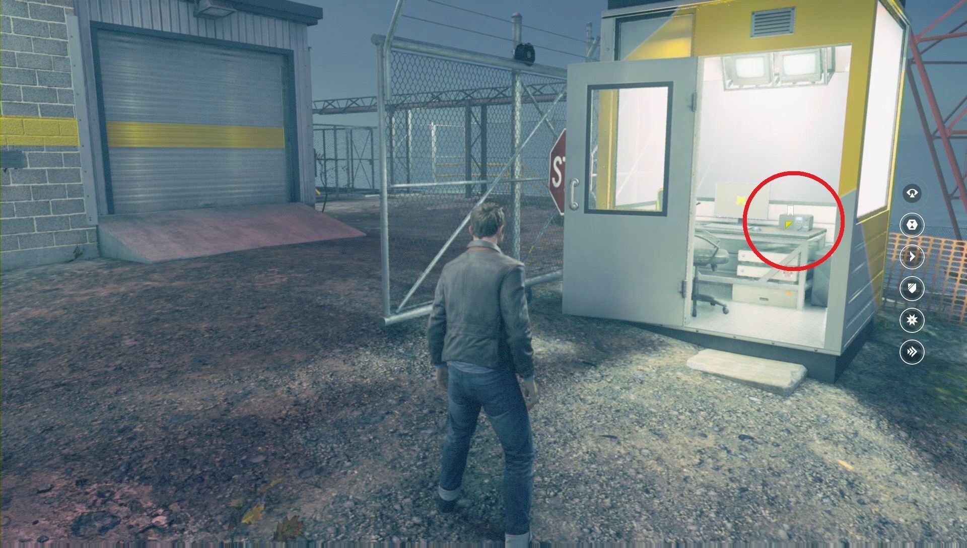 Sube las escaleras, cruza la reja y prepárate para algo de acción. Cuando esté todo despejado, sube a lo alto y pulsa el panel. Avanza hasta la caseta del vigilante y escucha el programa de radio de Riverport de Theresa Sedmak (RR. PP.) / Bobby Radford (postura dura).