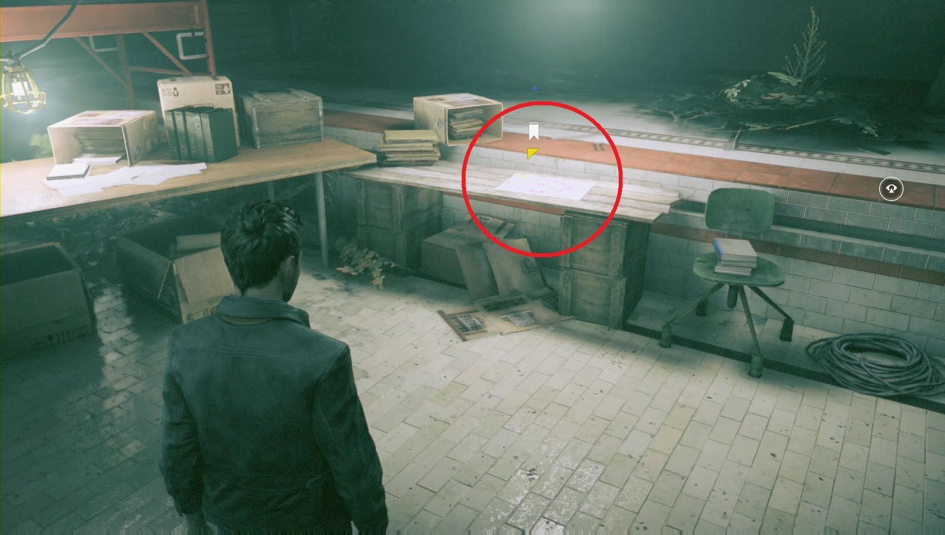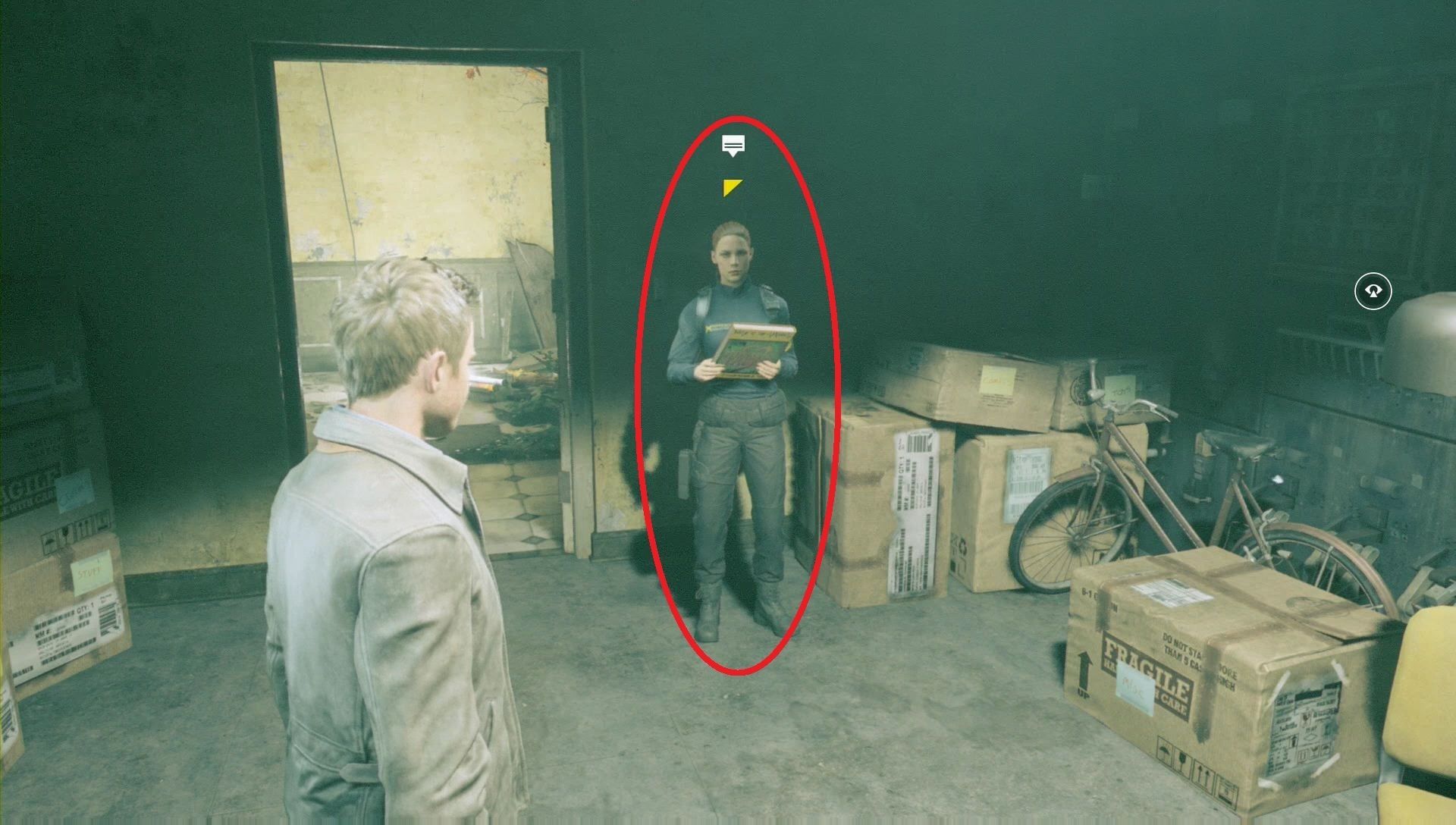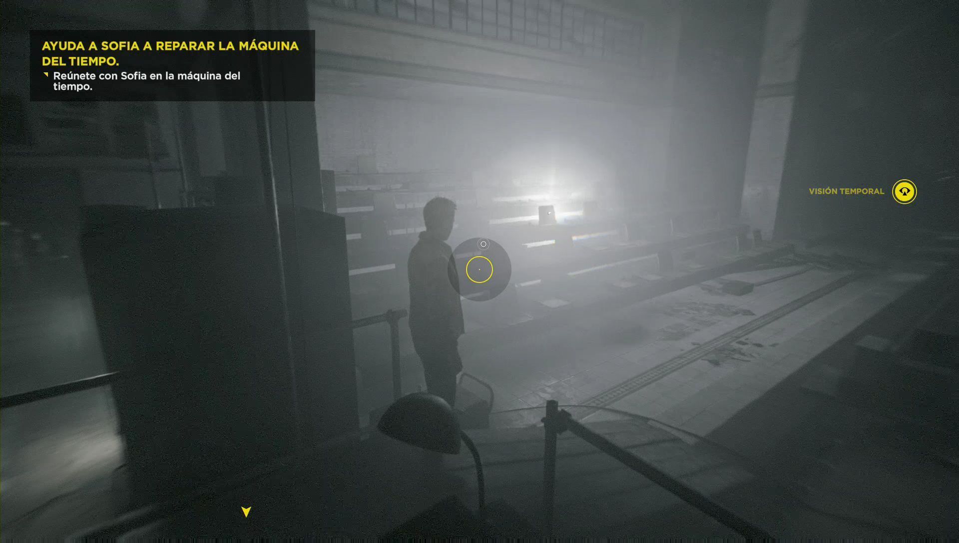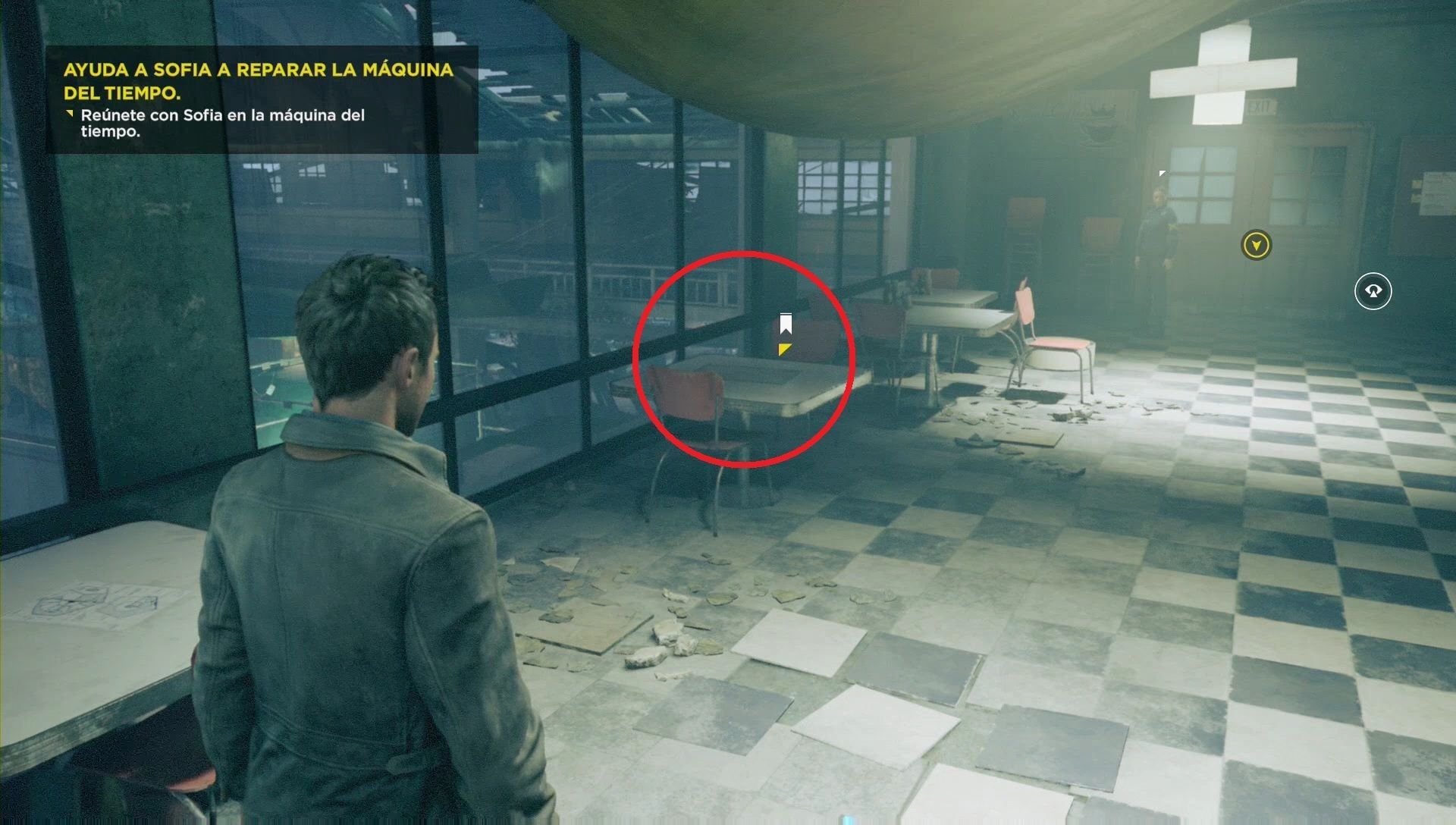 En el rincón, detrás de la máquina del tiempo, puedes ver un eco del pasado. Rodea la estancia y dirígete al lado que antes ocultaba el pasillo desplegado, donde estará tu acompañante. Tras hablarle, podrás encender la tele y ver un vídeo de Will.