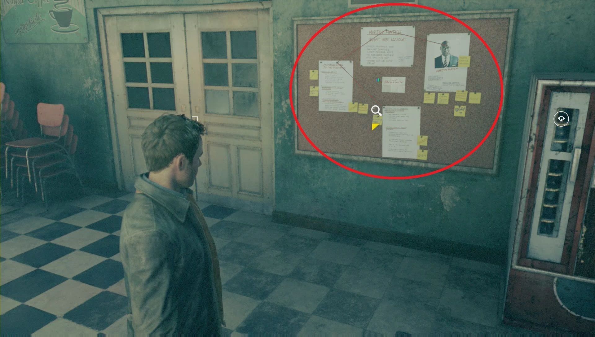En la pared, observa el expediente de Martin Hatch.