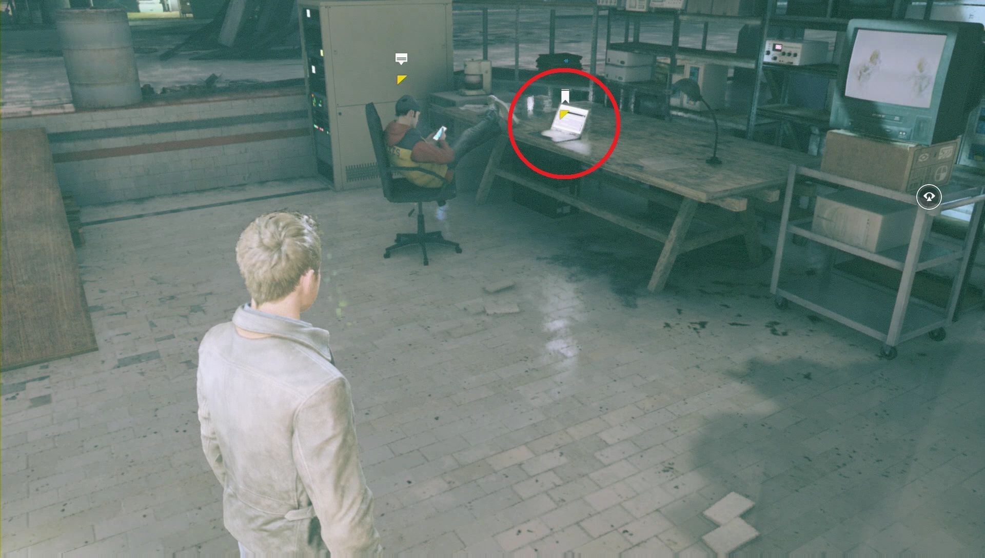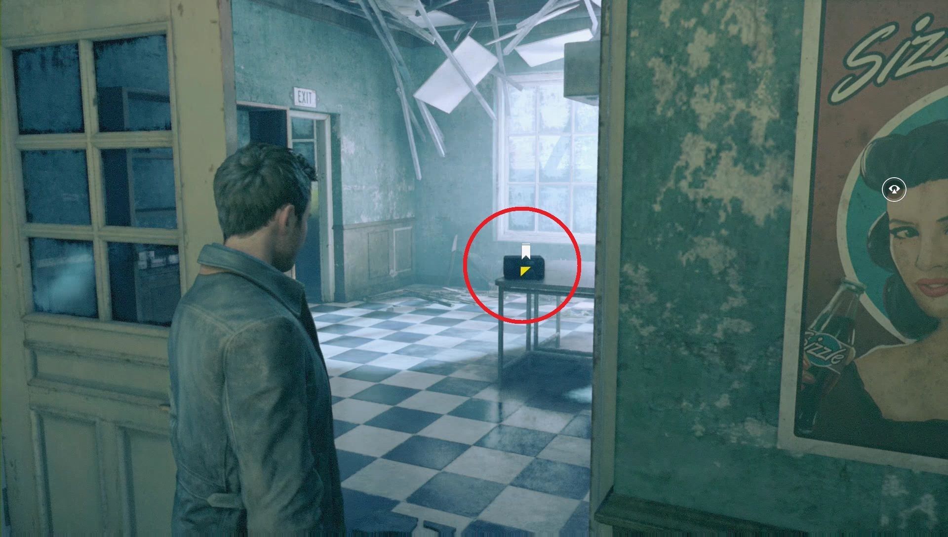 Ve por la puerta a los aseos y, en el almacén a oscuras, espera a que venga Beth y encienda la luz. Habla con ella para desbloquear una onda cuántica.