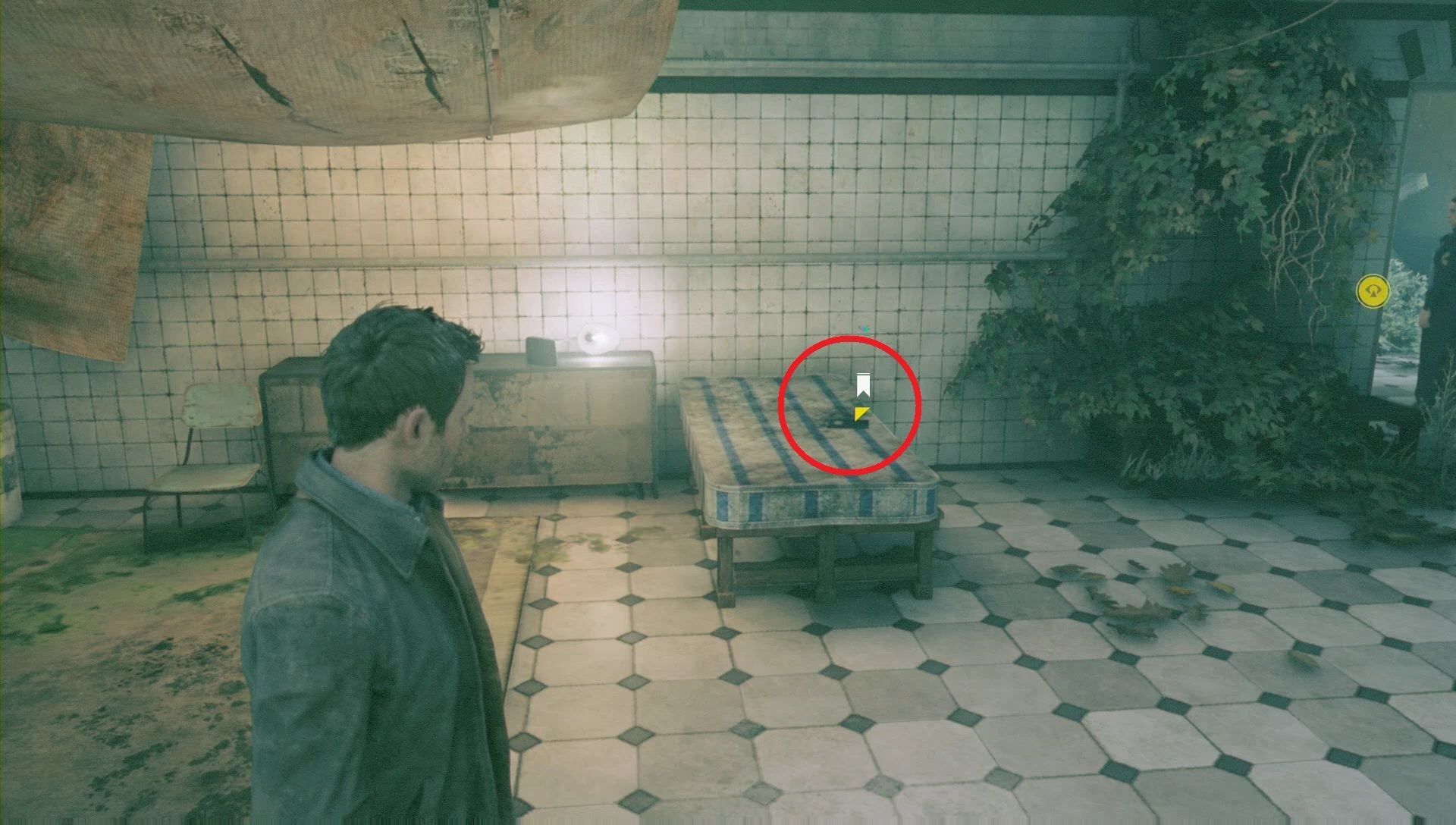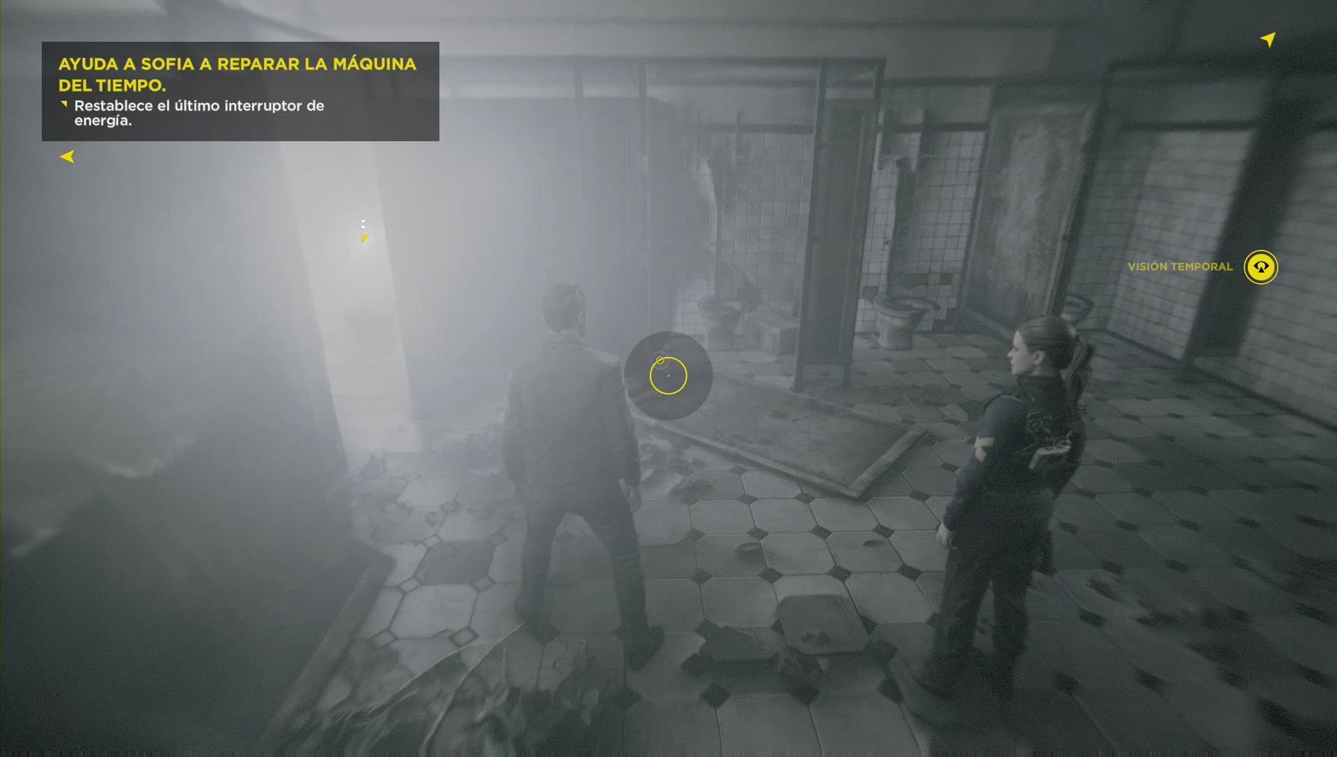 Sigue a Beth al aseo de hombres y busca una fuente de chronon en uno de los inodoros.