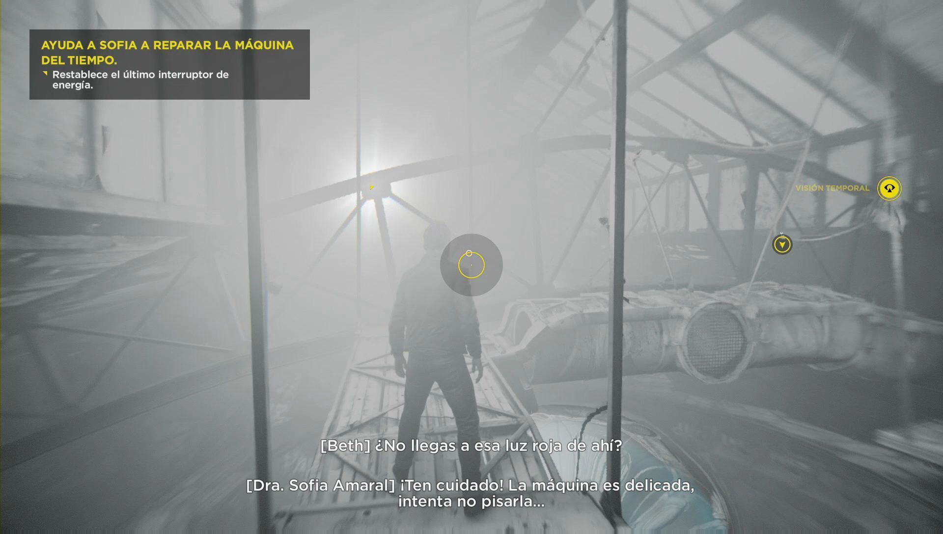 Pulsa el interruptor rojo y desciende hasta el pasillo circular. Rodéalo para llegar a la consola de controles y así activar el pasillo de la máquina. Baja a suelo firme e interactúa con el ordenador para poner la fecha. Sigue a Beth.
