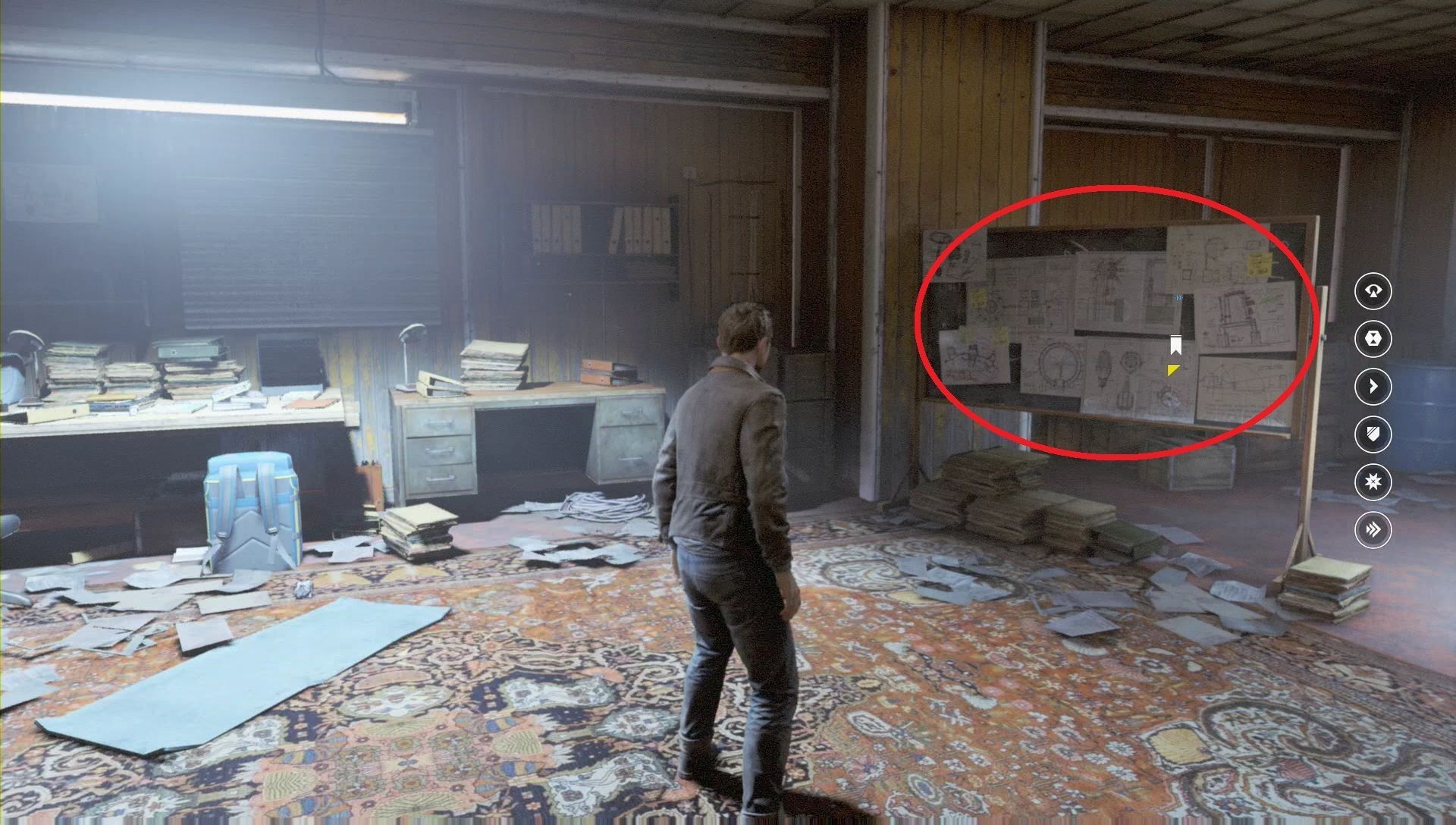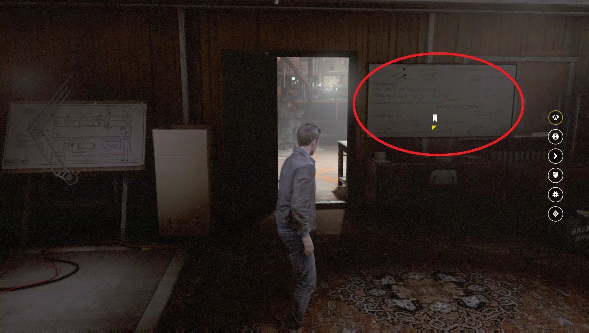 Baja los escalones, activa el eco del pasado y sigue el cable naranja. Abre la puerta. Dentro, inspecciona la pizarra de Will.