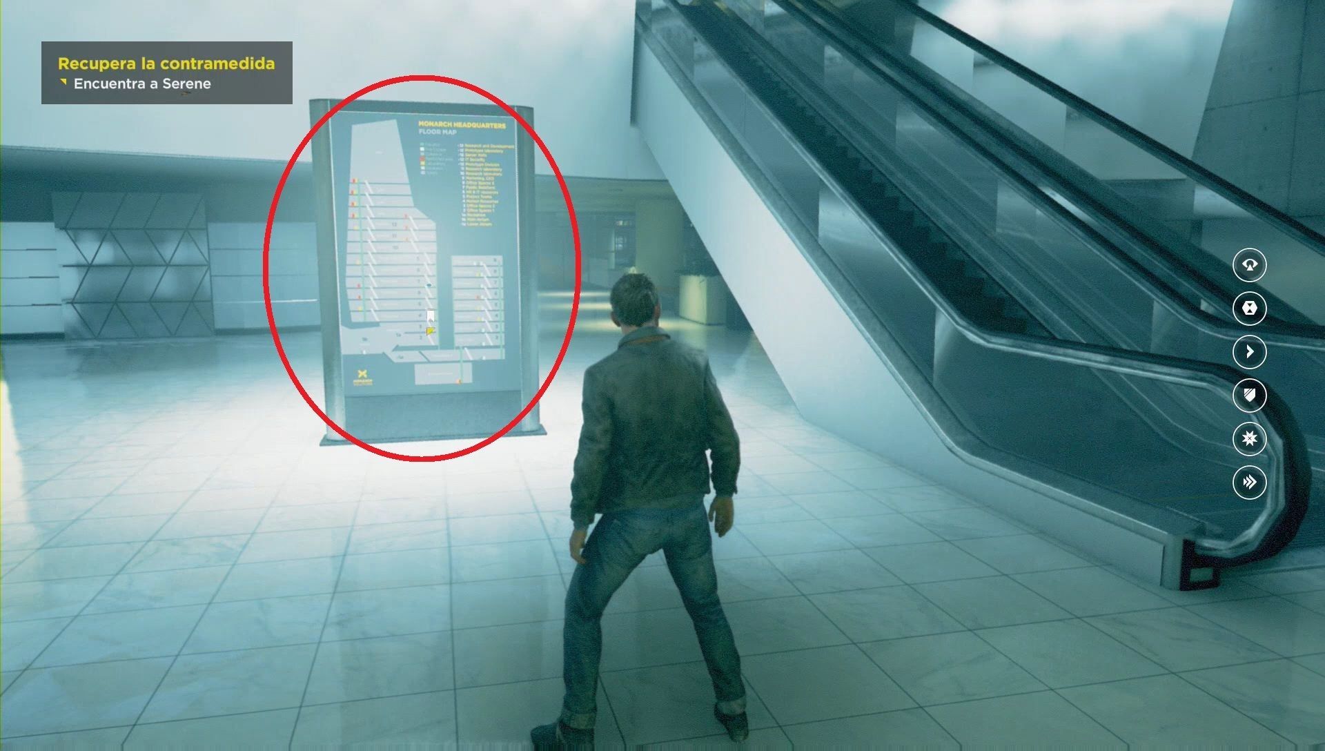 Visualiza el eco del pasado en las escaleras mecánicas. Inspecciona el cartel cercano con el mapa de la Oficina Central de Monarch.