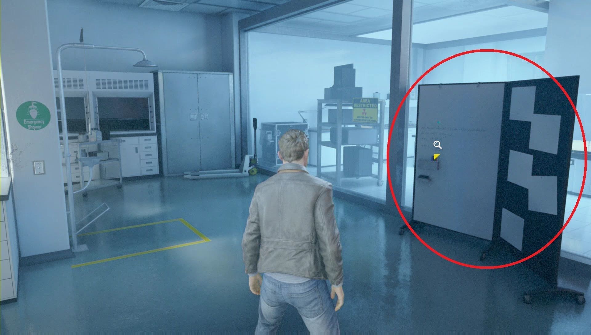 Sal, entra en el almacén de químicos y abre la puerta. Automáticamente te pondrás a cubierto y te tocará hacer frente a los primeros enemigos. Una vez despejado, interactúa con la pizarra de la derecha para desbloquear una onda cuántica.