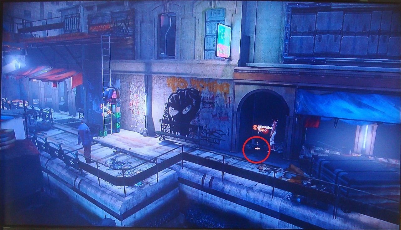 (Episodio 1) Está al fondo de la pasarela junto al muelle del mercado flotante, justo antes de subir las escaleras que te llevan hacia el Leaking Brain.