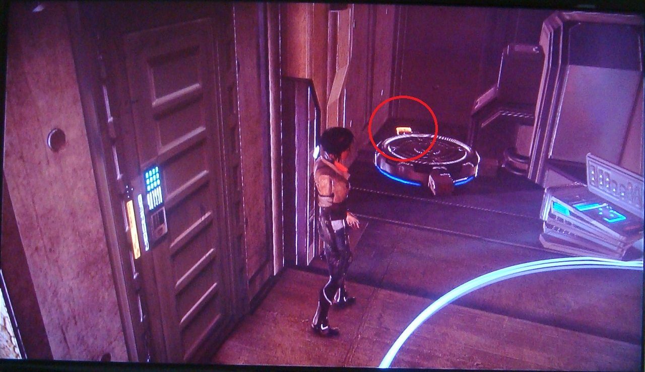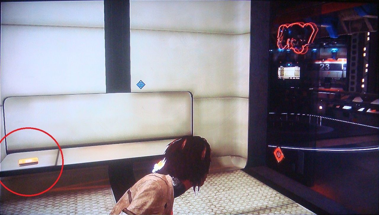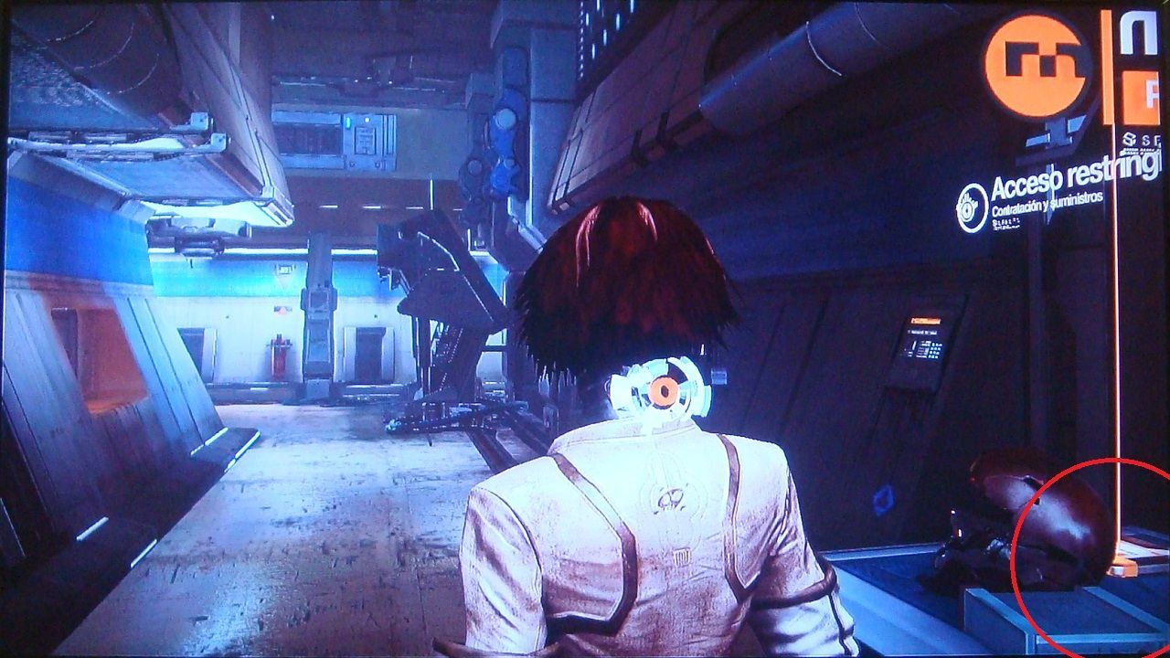 Estamos en La Bastilla. Sube el primer escalón y sigue las dos líneas rojas del suelo hasta toparte con un robotito de vigilancia. Cuando esté de espaldas a ti, corre hacia la habitación abierta que hay en medio del pasillo. Espera a que pase de largo y sigue el pasillo hasta el fondo girando a la derecha. Recoge el potenciador de concentración.