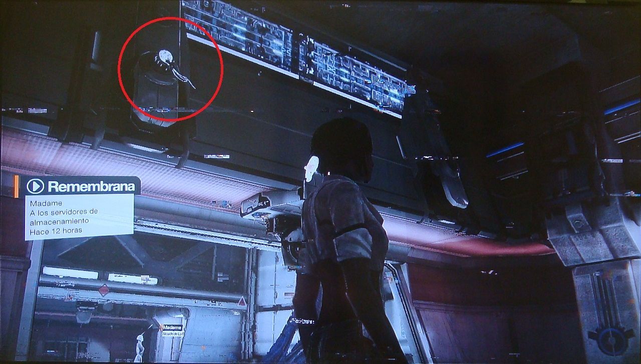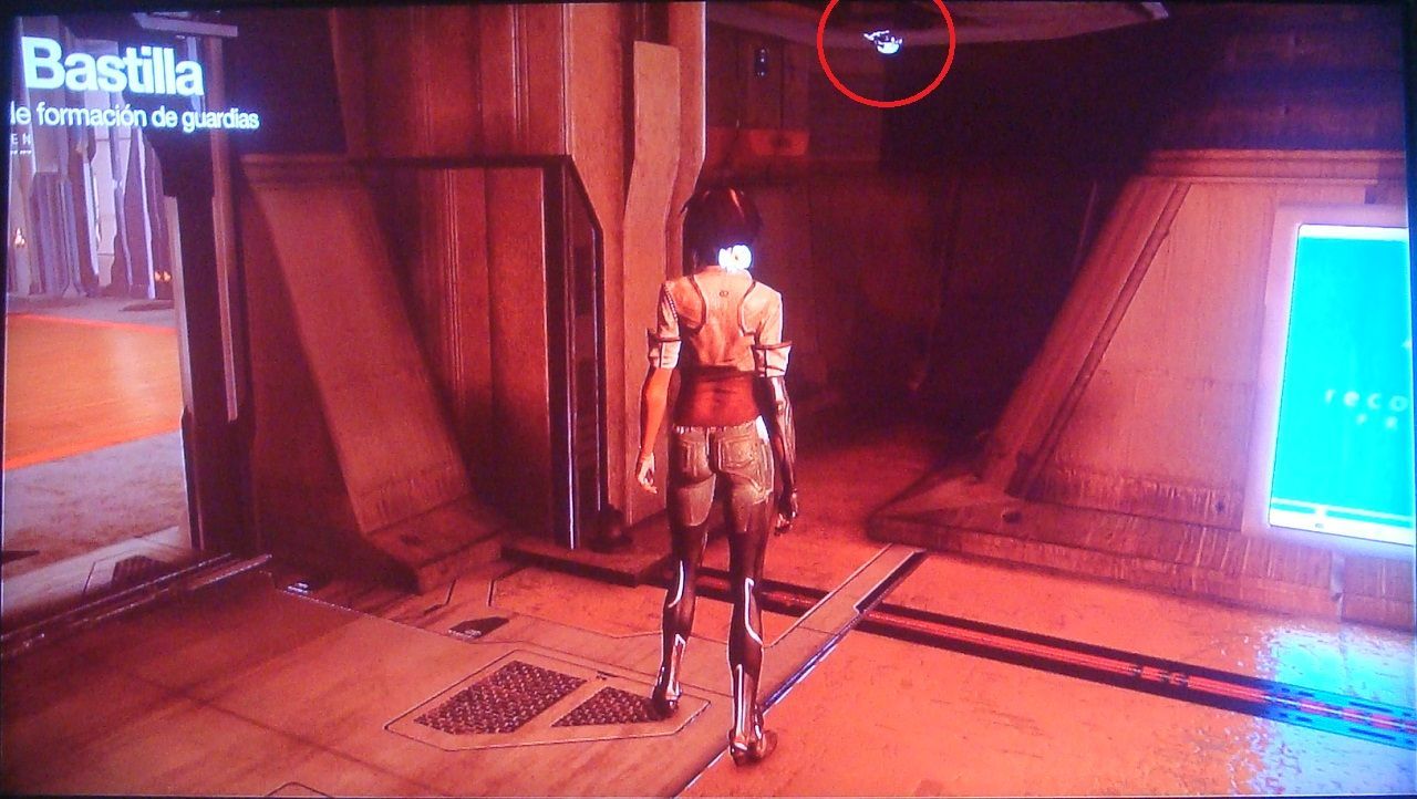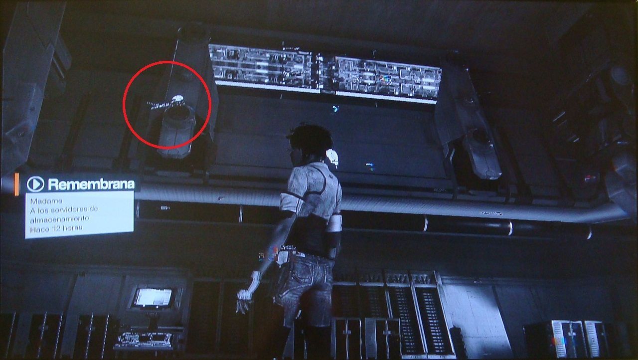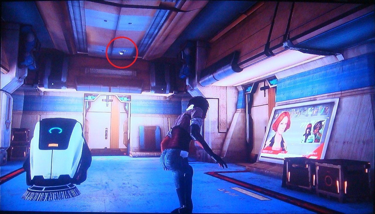 13. Tras entrar en la zona restringida de color azul, ve hasta el fondo todo recto y localízalo en el techo, junto al robot que limpia y el panel con las noticias.